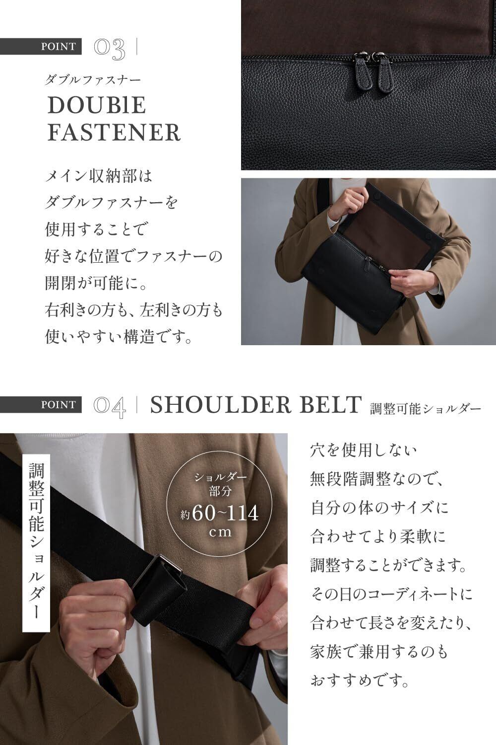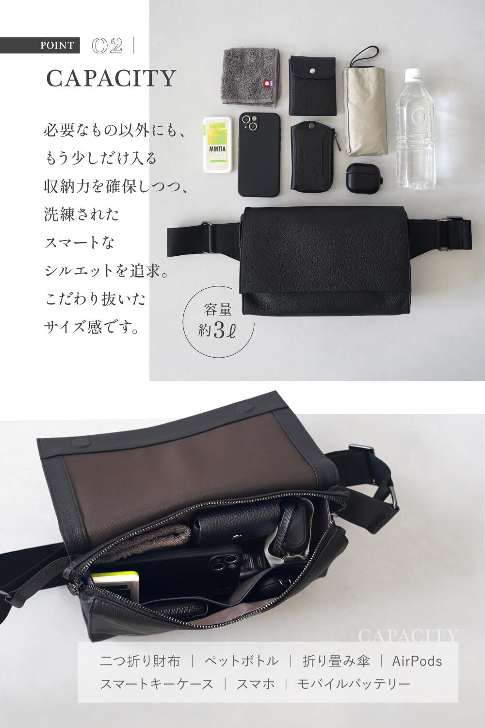 【ちょうどいい収納力】\見た目以上に頼れる約3リットル収納/ 財布や500mlペットボトル、スマホ、小物類などがしっかり収まります。 必要なもの以外にも、もう少しだけ入る収納力を確保しつつ、洗練されたスマートなシルエットを追求。こだわり抜いたサイズ感。(収納例)二つ折り財布・ペットボトル・折り畳み傘・キーケース・スマホ・エアポッズ・ハンカチなど