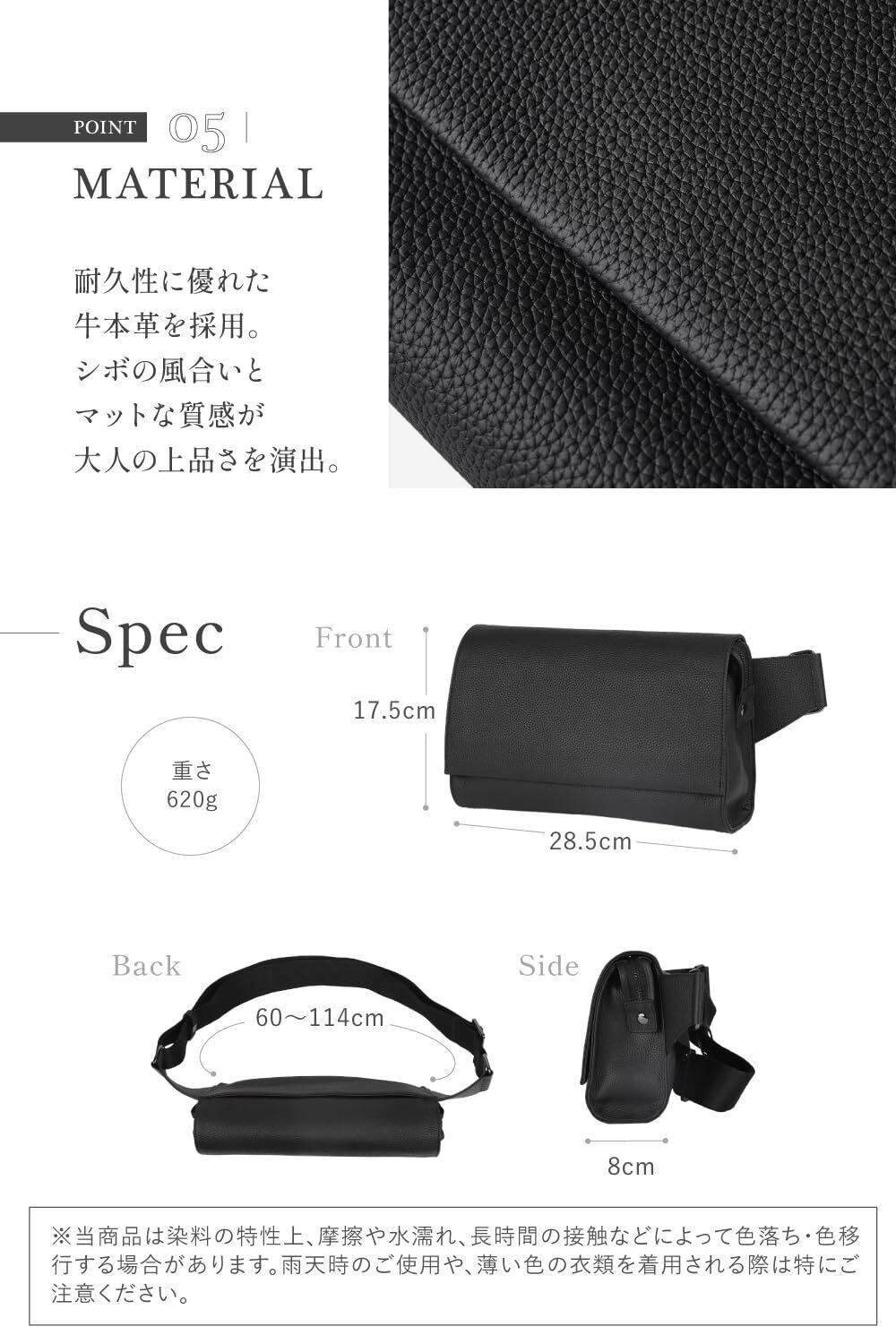 高品質の牛革を採用しており、優れた耐久性と独特な風合いを持ちます。使い込むほどに味わいが増し、愛着が湧くこと間違いなし。また、上品でシンプルなデザインは、どんなファッションにも合わせやすく、普段使いはもちろん、特別な日のお出かけにも最適です。