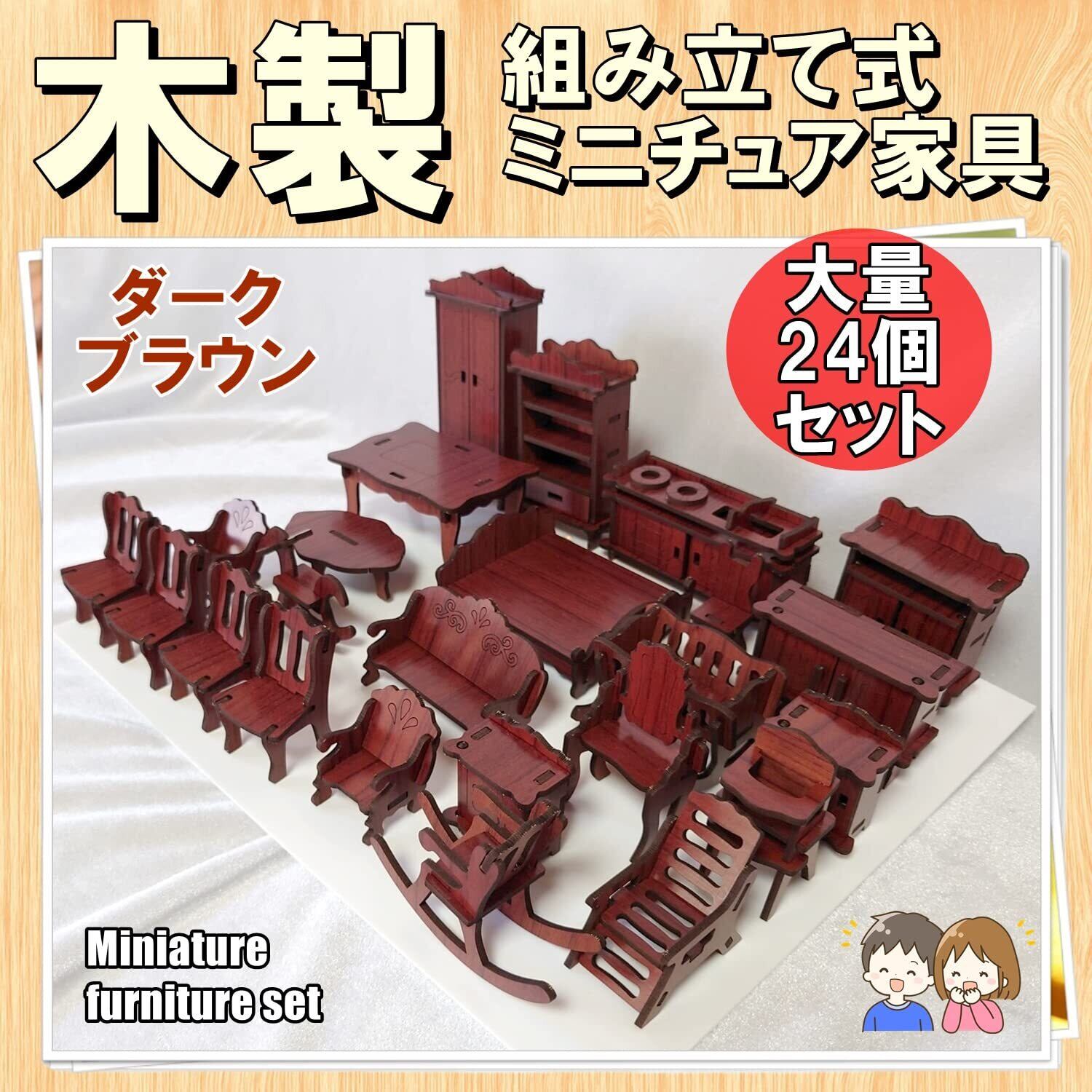 木製 ミニチュア家具 セット ドールハウス 簡単 組み立て キット 工具不要 おままごと 小さい家具 (ダークブラウン)