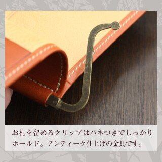 日本最高峰の植物タンニンなめし牛革「栃木レザー」の札ばさみです。 天然の革の素材感を大事にしたナチュラルな素材。 革を使い込む「エイジング」を楽しめるアイテムです。 日本国内で職人の丹念な仕事によって作られた逸品です。 お札をスリムに収納できる札ばさみ。カード入れは3枚分つき。アンティーク仕上げの金具を使用。