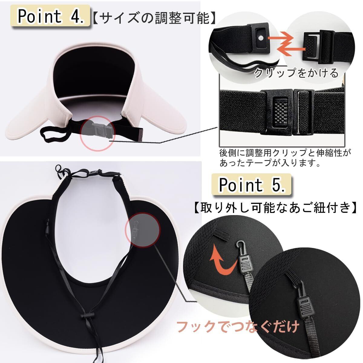 4.【紫外線対策・小顔効果】12.5CMのつばは顔全体を覆いた、しっかり日差しから遮ってくれるだけでなく、小顔効果があります。ツバ裏には紫外線を反射しないマット黒いUVカット板の仕様、顔への紫外線UVA・UVBを反射防止します。顔をしっかりガードできるからうっかり日焼けしちゃった、日射病を防止します!【汗吸収バンド】インナー部分は吸汗性に優れたスポンジ素材を使用しており、柔らかく快適な着用感を実現。メッシュ構造で通気性と速乾性に優れ、頭部の爽やかさを維持します。【取り外し可能なあご紐付き】取り外し簡単のあご紐付きなので、デイリーにもスポーツシーンにも着用時、ご安心ください!