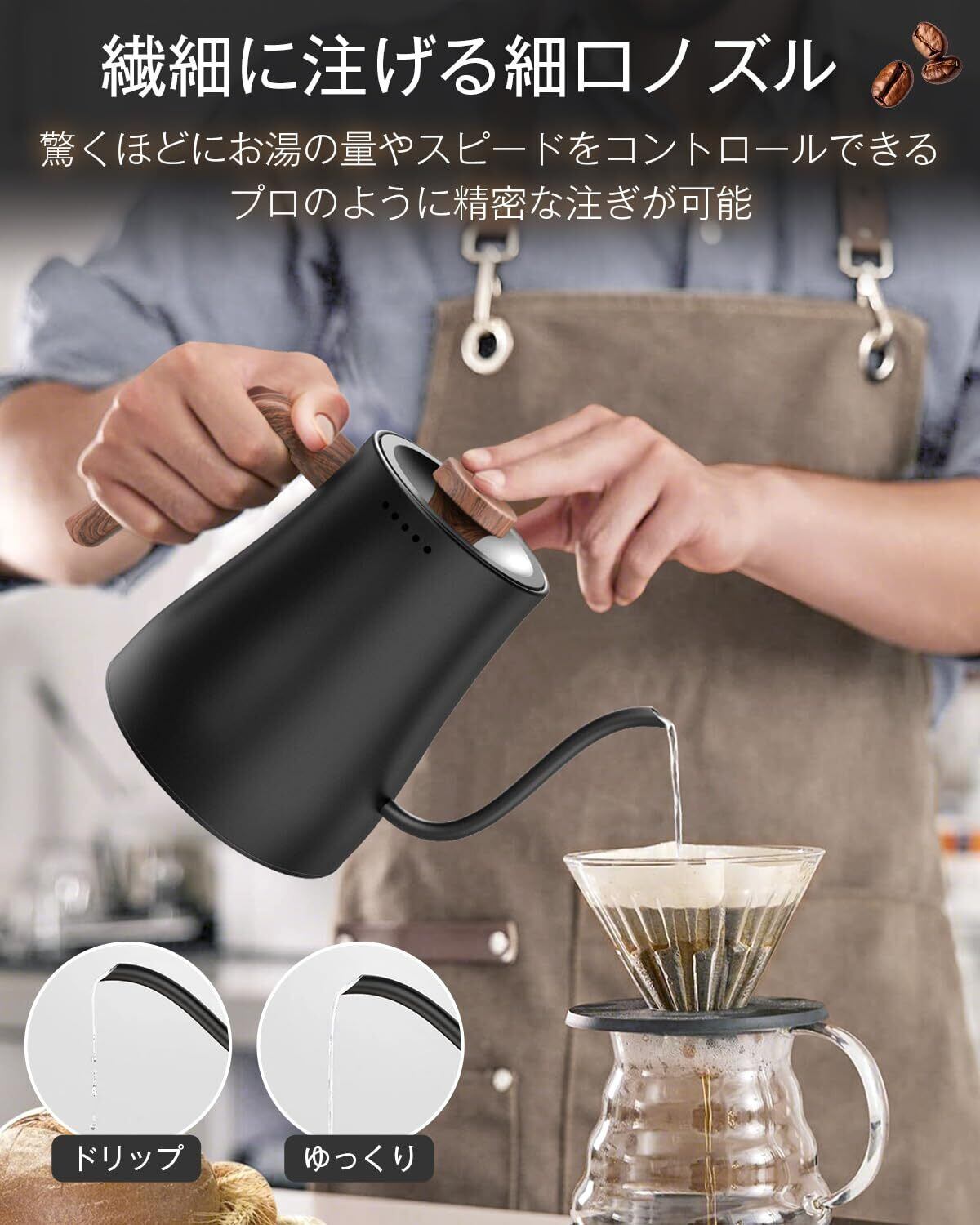【スピード沸騰・304食品級ステンレス・安全保護】ドリップケトルは1000Wのハイパワーにより、カップ1杯分(150ml)なら約90秒で沸騰します。忙しい朝や急な来客でも、すぐにお湯を沸かせてコーヒーやお茶をいれることができます。本体のスチーム穴から蒸気が手にかかりにくい角度設計。内部は耐久性が高い食品グレードのステンレス素材を使用、プラスチックの臭いが苦手な方におすすめです。安全面に優れた「空だき防止機能」や「自動電源OFF機能」も搭載。水がなくなったら自動的に電源をオフにし、空だきによる本体破損や火災を防止します。沸とう後に自動的に電源をオフにし、電気代の節約にも繋がります。