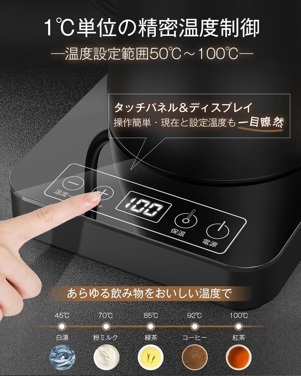 【1℃刻みで温度設定・ワンタッチ沸騰・4時間保温機能】コーヒーや茶葉など、飲み物の種類によって最適な抽出温度が異なります。Aliliyのコーヒーケトルは様々な用途に合わせて、50℃から100℃まで1℃単位での細かい温度調整ができるので、コーヒーや紅茶、粉ミルクやラーメンなどの料理や飲み物の調理に便利です。高精度センサーチップ搭載、ディスプレイに温度を示し、温度管理がしやすい、初心者も手軽に適温でコーヒーやお茶が抽出できるので、その風味や香りを最大限に楽しめます。すぐに沸かしたいときに便利なワンタッチ沸騰機能も搭載。さらに、湯沸かしケトルは40℃~95℃まで1℃単位で保温温度を設定可能、設定した温度に合わせて4時間の保温ができるため、赤ちゃんのミルクなどに便利です。