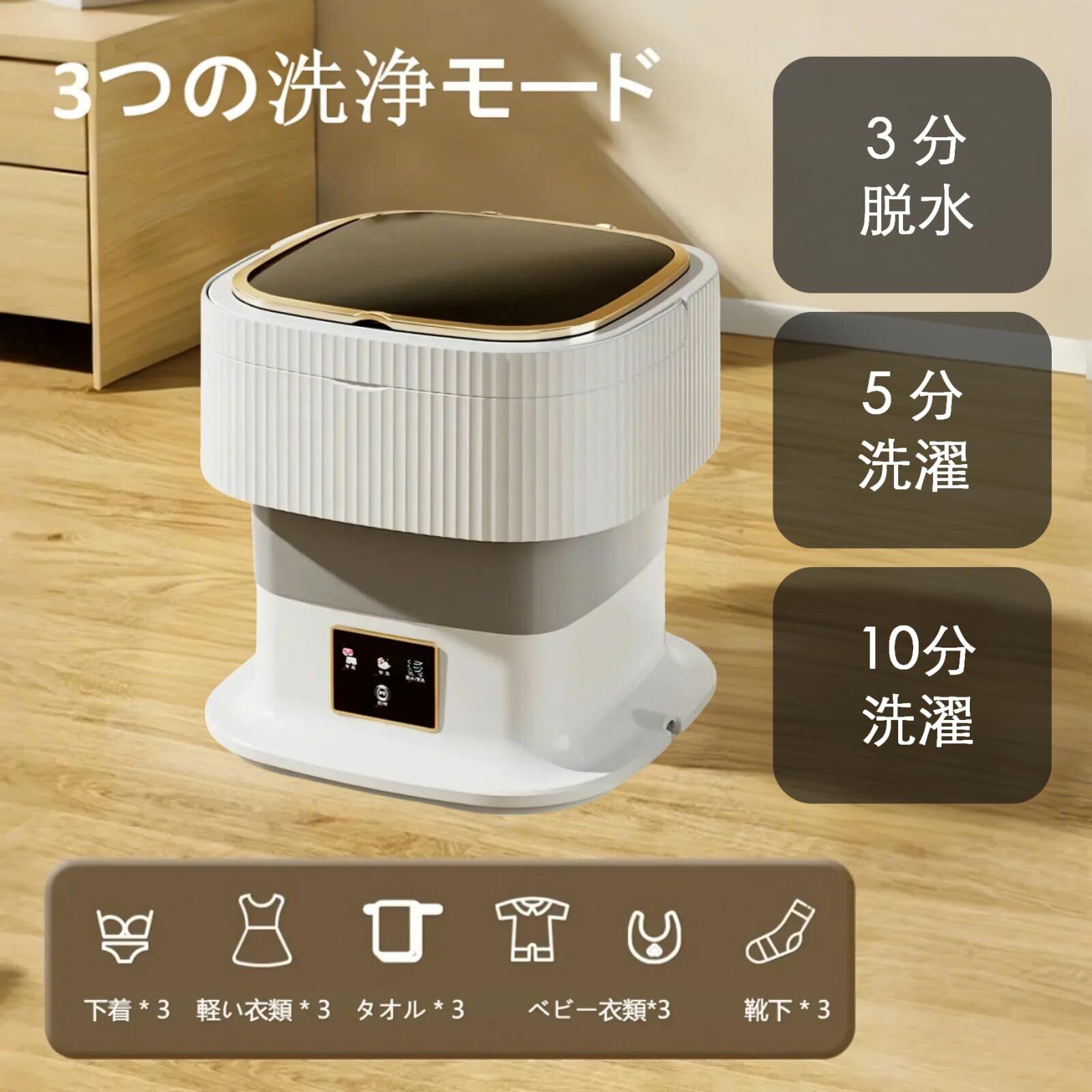 特徴:5/10分洗濯・3分脱水対応、海外対応、折りたたみ式