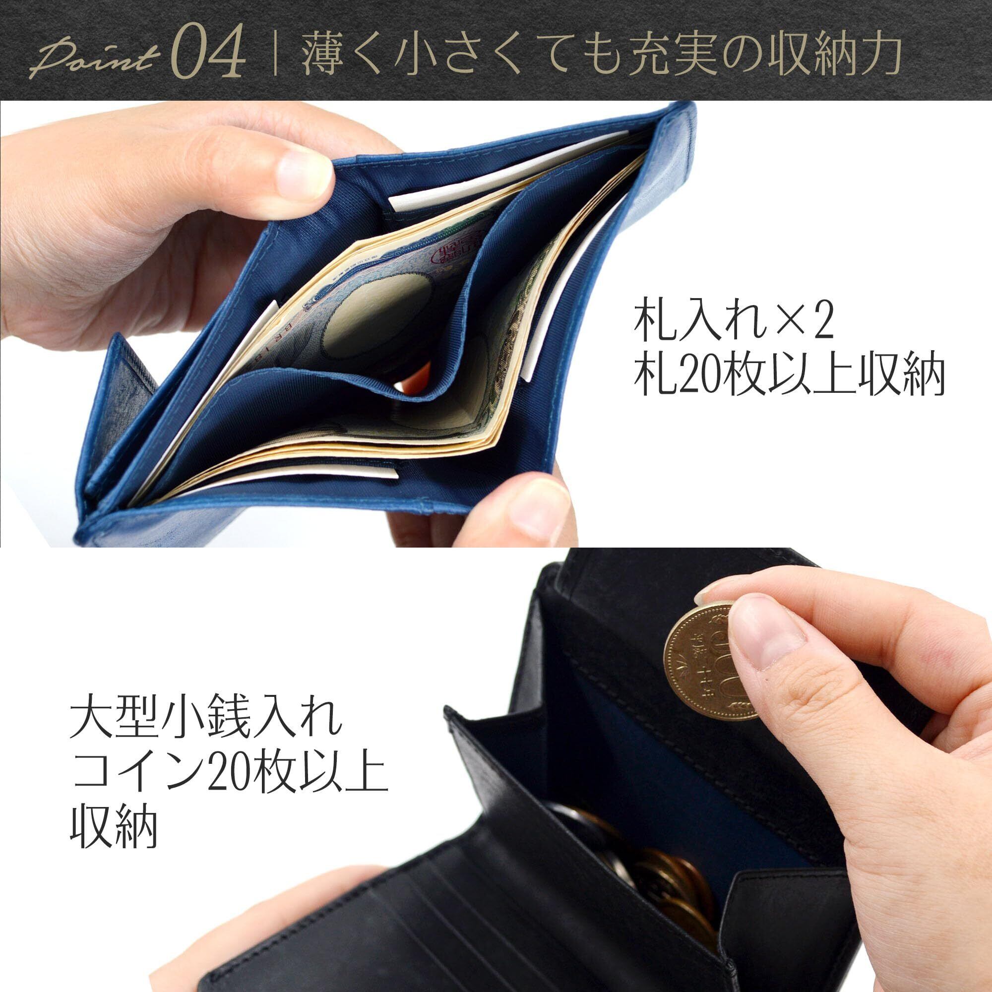 【薄く 小さく たくさん入る 2つ折り財布】 薄型コンパクト財布でありながら、札20枚・小銭20枚・カード10枚収納可能な充実の収納力。沢山収納してもスナップボタンが財布の開きを防ぎます。小さなボディに驚きの収納力を兼ね備えた コンパクト財布 です。