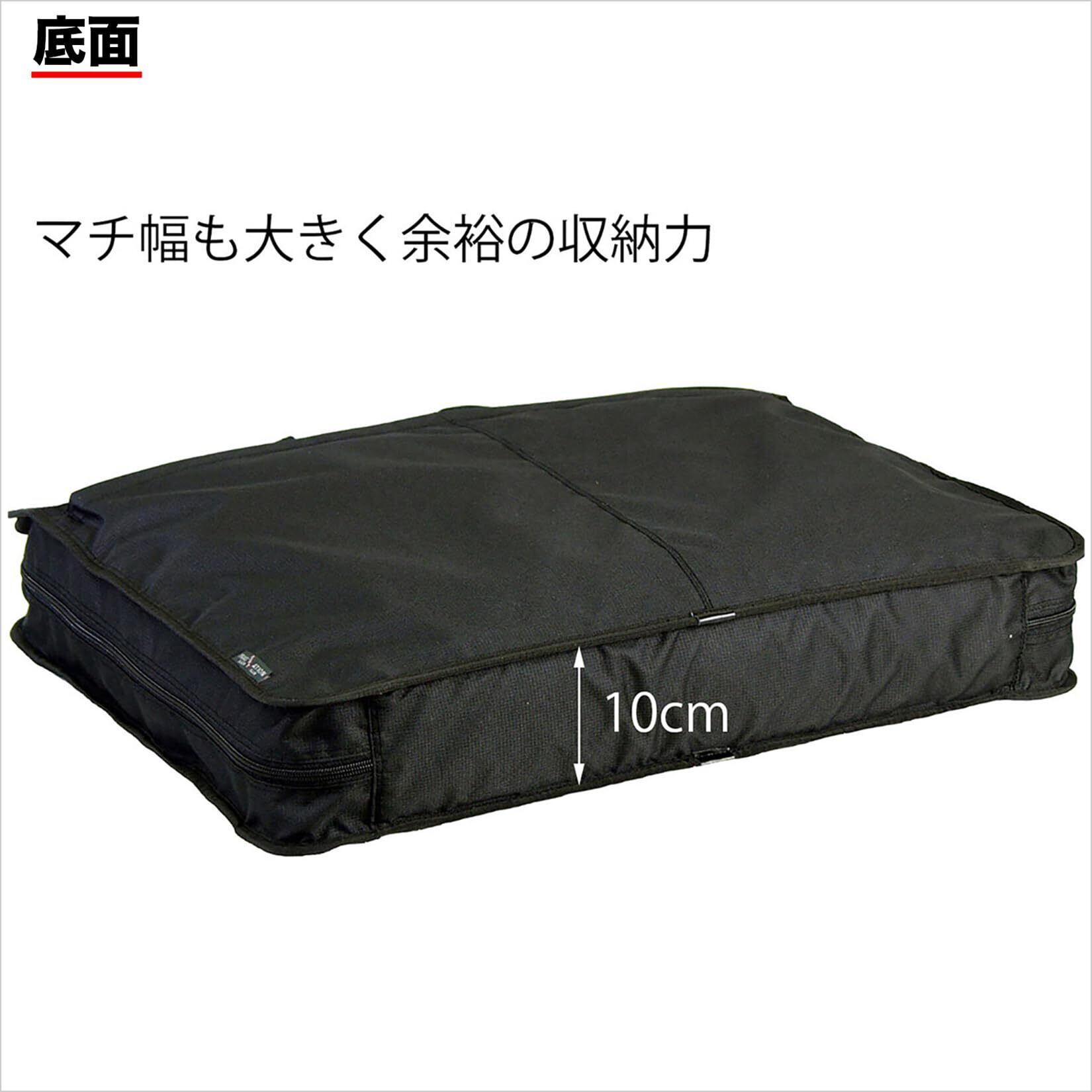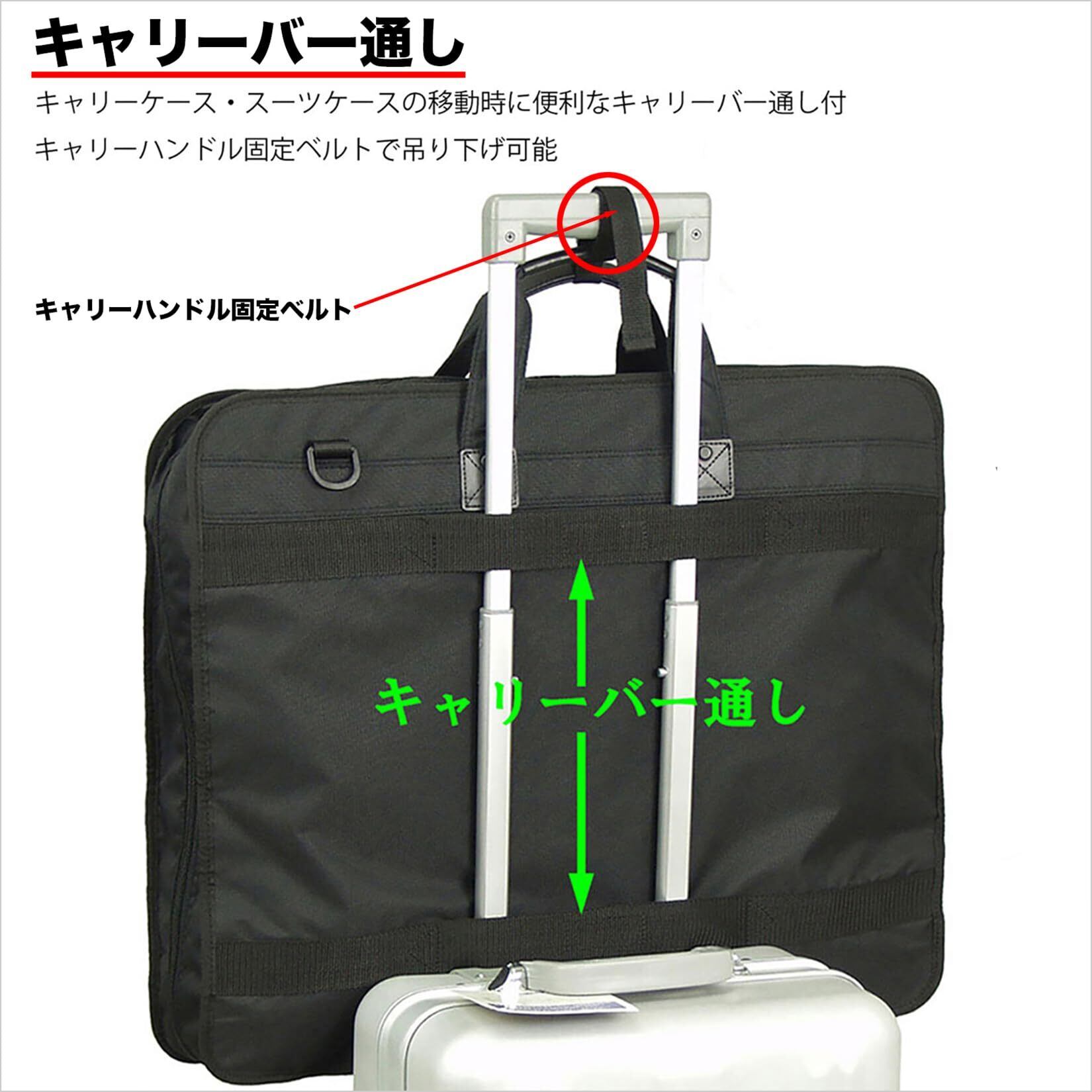 マチ幅が広く、大柄のスーツ類も収納できる設計で、キャリーハンドル固定ベルト付き。