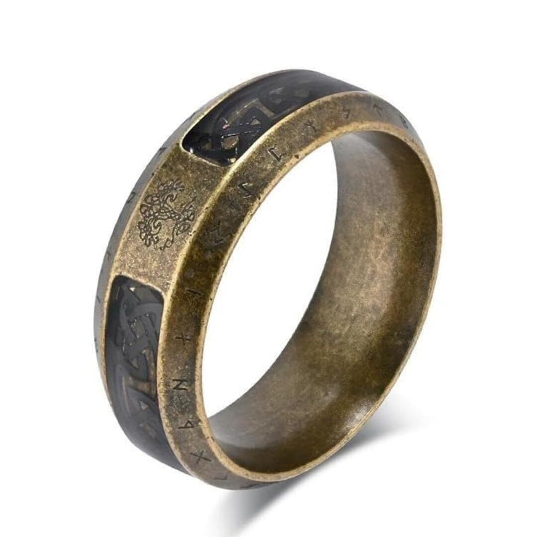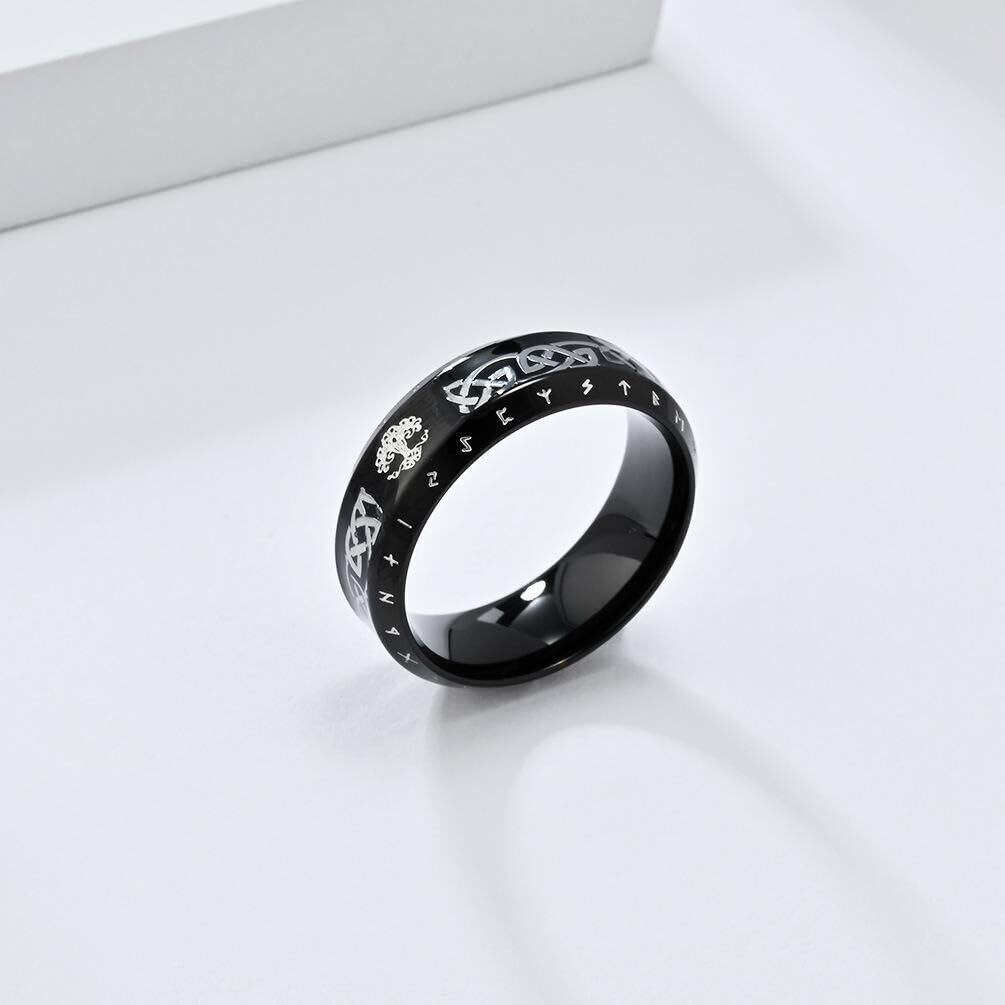 『[Rockyu] リング』は、北欧の美しいデザインを取り入れたおしゃれなステンレス製の指輪です!8mmの幅で、ヴィンテージ感あふれるルーン文字と生命の樹、ケルト柄の彫刻が施されており、どんなスタイルにもアクセントを加えることができます。
