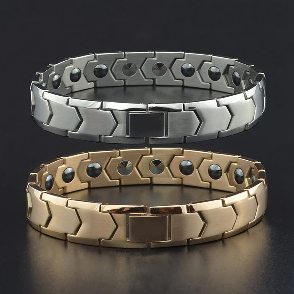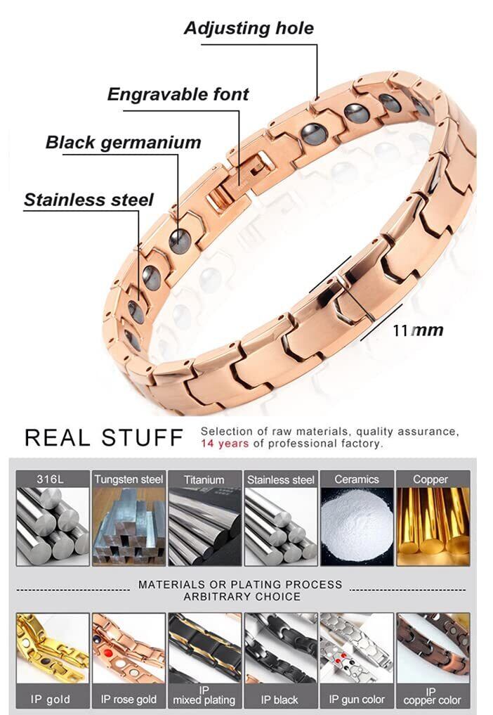 【磁気ブレスレット】:純チタン鋼素材と亜鉛メッキコーティングは100%低アレルギー性で、肌を刺激したり、鋼や銅にアレルギー反応を引き起こしたりしません! チタン鋼は非常に強く、軽く、錆びることがないため、日常着に最適です。