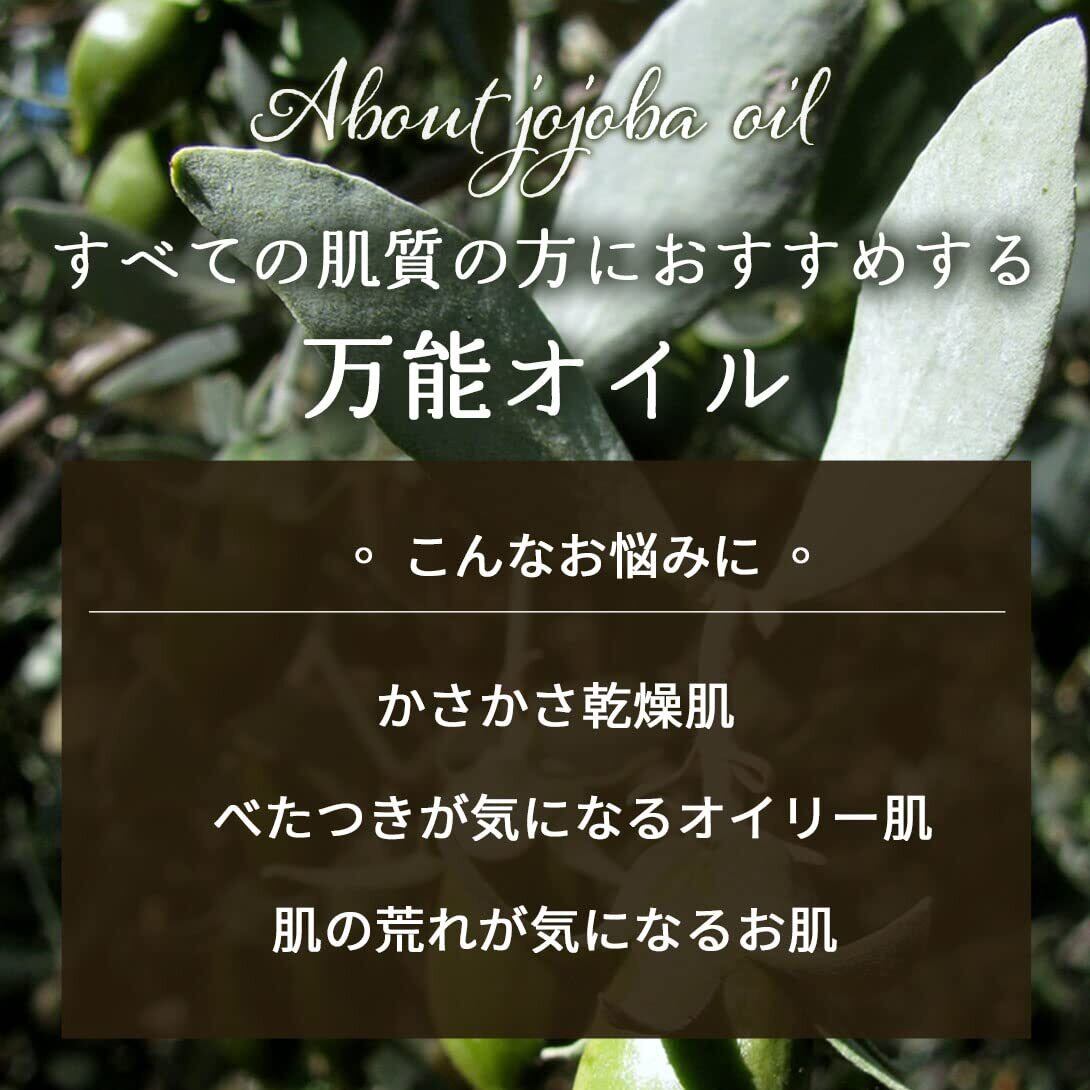 このホホバオイルは、フェイスオイルとしてはもちろん、全身のマッサージオイルとしても活躍します。軽やかな使用感で、べたつきが気にならず、日常のスキンケアに手軽に取り入れられます。脱臭処理を施しているため、独特の香りを気にせずにお使いいただけます。