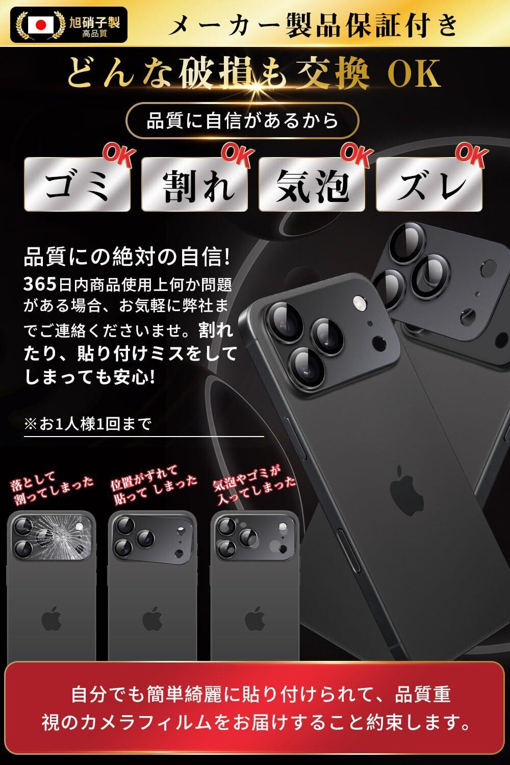 【露出オーバー防止!カメラレンズ保護 】大切な 17 Pro Maxのカメラレンズを全面保護するため、3眼のレンズ部分だけではなく、四角い台座部分もカバーする剥がれにくいレンズカバーです。フラッシュ撮影する際に被写体や風景の明るい部分を白飛びしないように保つので、写真や動画が真っ白に映ってしまう可能性を減らします。撮影時の露出オーバーを効果的に防止し、高画質な画像が得られます!(ご注意:本製品は露出オーバーを完全に防ぐものではありません。)