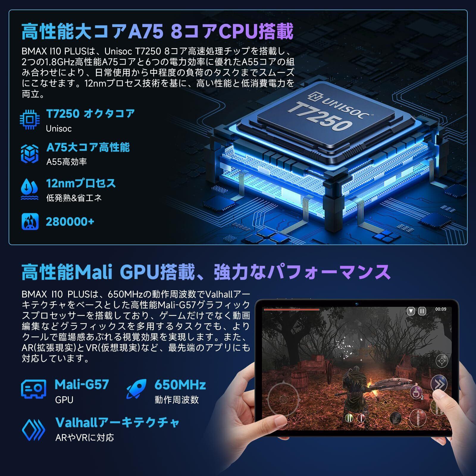 【高性能T7250 8コアCPU & Mali G57 GPU】Unisoc T7250オクタコアプロセッサを搭載したBmax I10 Plus タブレット 10インチは、1.8GHzで動作する2つの高性能A75コアと6つの電力効率に優れたA55コアの組み合わせが自慢です。最新の12nmプロセス技術を使用することで、消費電力が低くなります。このタブレットにより、仕事とマルチメディアの両方で最適なパフォーマンスがされ、シームレスでエネルギー意識の高いタブレット体験を提供します。また、G57グラフィックプロセッサを搭載し、ゲーム、ハイビジョンビデオ再生、およびグラフィックス密度の高いアプリケーションに適した強力なグラフィックス性能を提供します。