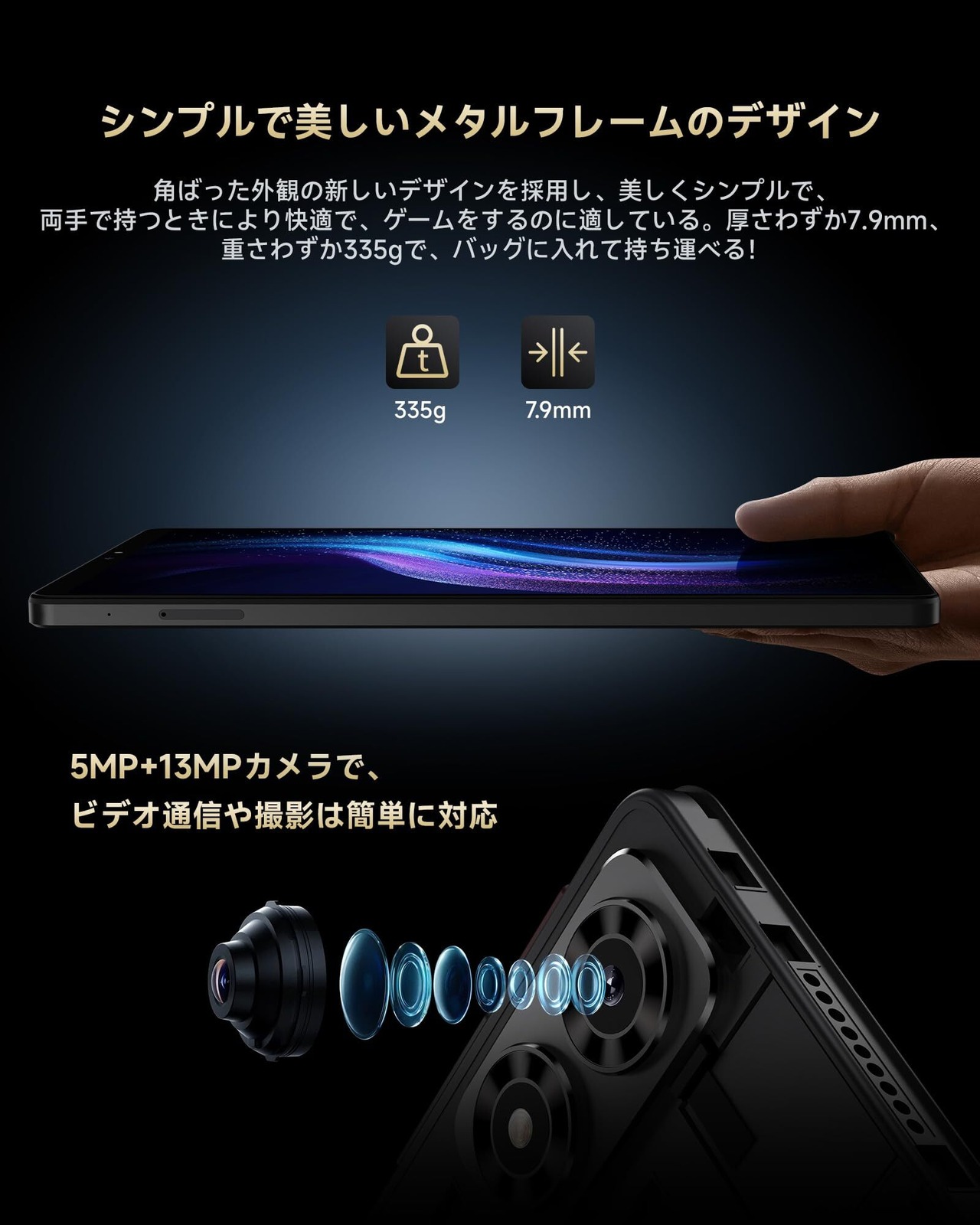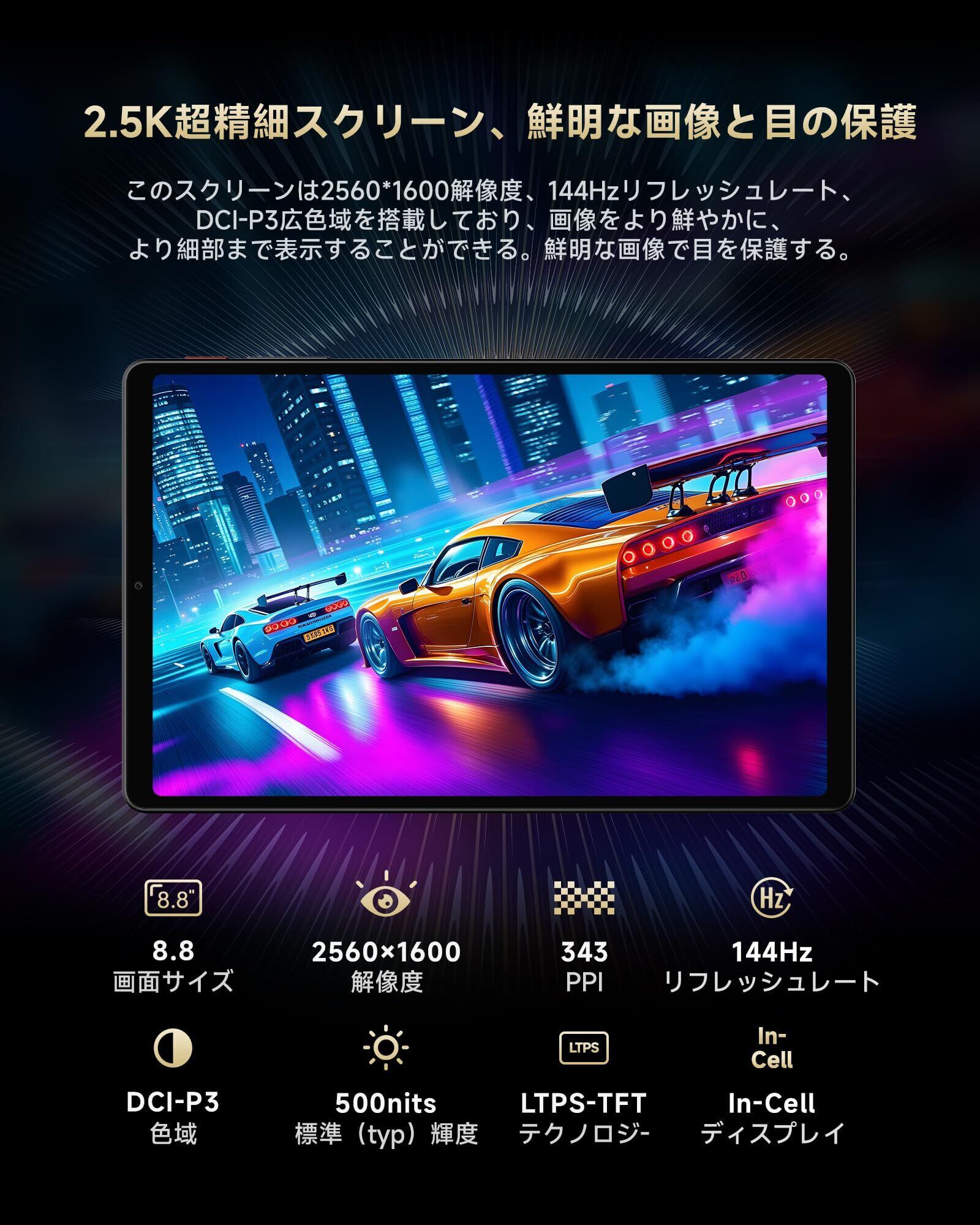 ・特徴:8.8インチディスプレイ、Snapdragon 7+ Gen3、2560×1600解像度、144Hzリフレッシュレート、20GB RAM、256GBストレージ(最大1TB拡張可)、7300mAhバッテリー、PD20W充電、デュアルスピーカーDTSサウンド、Wi-Fi6、Bluetooth 5.4、Widevine L1対応