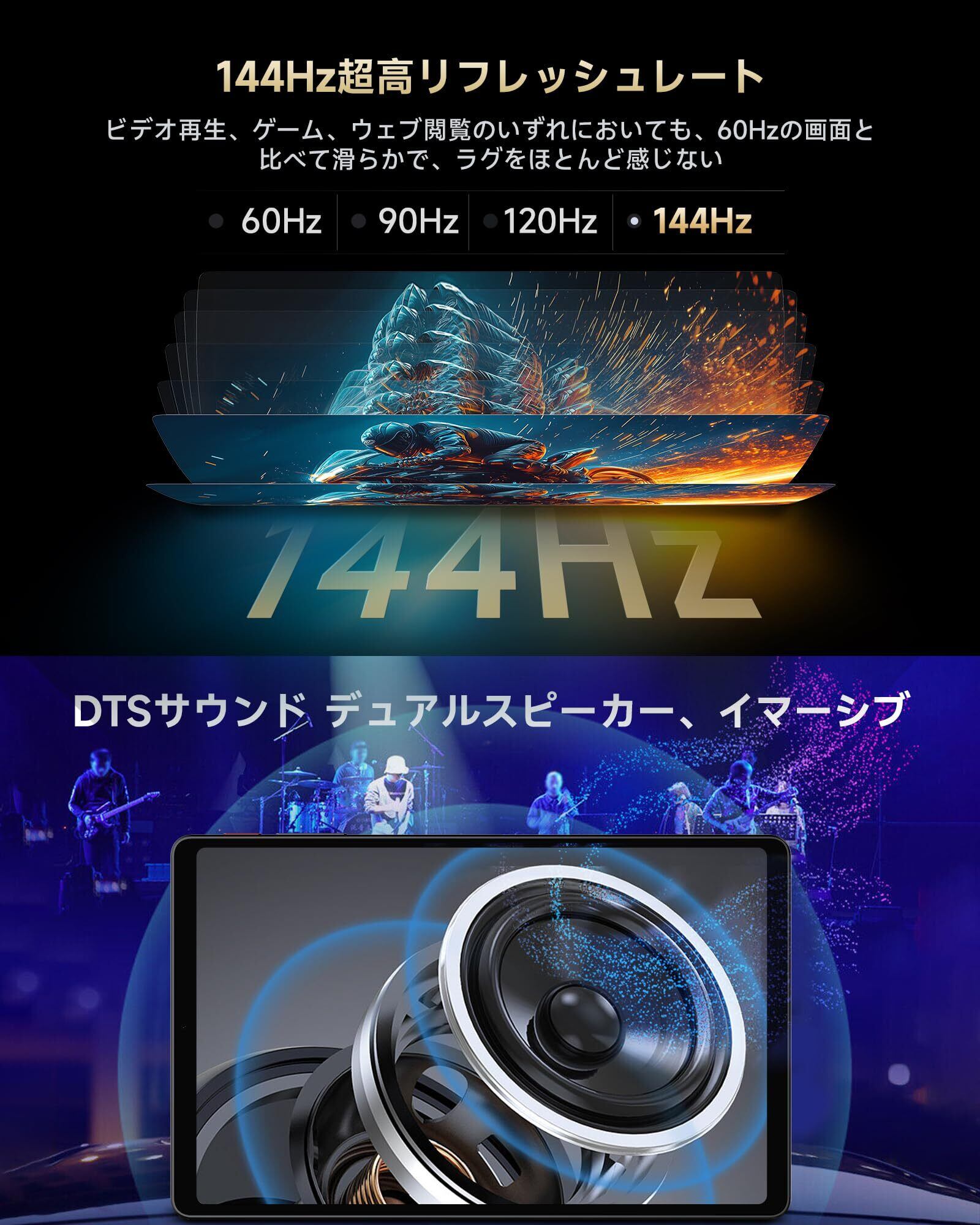 【144Hz高リフレッシュレート、1600×2560解像度、500nit高輝度、343PPI、DTSサウンド】144Hz高リフレッシュレートを備えた8.8インチIPS液晶が、スクロールからゲーム操作まで「ほぼ遅延のない世界」を実現します。1600×2560解像度と343PPIの高精細ディスプレイは、動画の質感も電子書籍の細かい文字も鮮明に再現し、500nit高輝度で屋外使用時の視認性を確保します。DTSサウンドチューニングが生み出す立体音響は映画の爆発音から音楽の繊細なニュアンスまで忠実に再現します。ヘッドフォン接続時には仮想3Dサウンドでゲームやコンサート動画の臨場感を倍増させます。Widevine L1 DRM対応で Primeビデオ、Disney+、hulu、Netflixも1080Pの高解像度動画を楽しむことができます。「見やすさ・触れやすさ・聴きやすさ」を進化させたこのミニタブレットは、移動中のエンタメからプロ級のクリエイションまで、あらゆるシーンでデジタル体験の新基準を示します。(リフレッシュレートは60Hz、90Hz、120Hz、144Hzの4段階に調整可能)