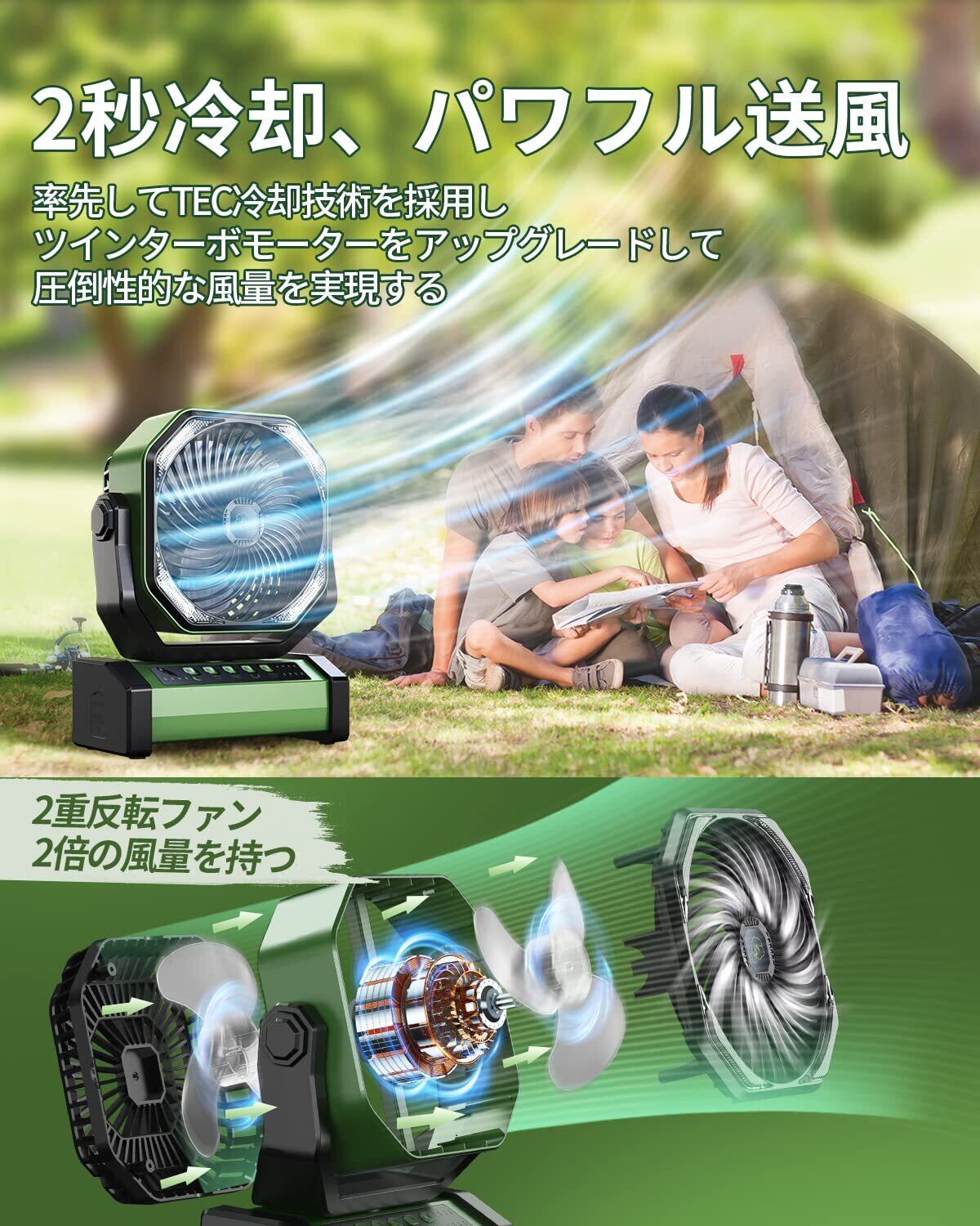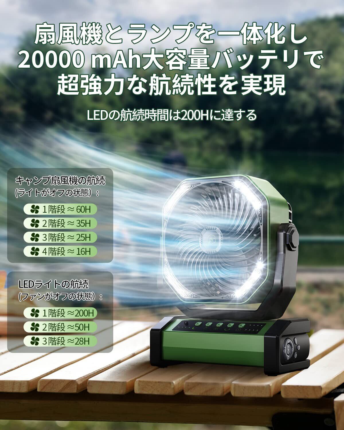 【頑丈な材質・切タイマー機能】このキャンプ 扇風機は頑丈で耐久性のある構造を採用し、落下や衝突を防ぐことができ、頑丈な台座は強力な安定性を提供し、サーキュレーターをしっかり固定させる。この扇風機は、あずまや、庭、キャンプ、遠足、ピクニック、釣り、ボートなどのアウトドア扇風機に最適です。素晴らしいキャンプの必需品、テントのキャンプ扇風機。室内での使用、学習、仕事、読書などにも適しています。※また、消し忘れ防止に切タイマー機能で、1・2・4・8時間が設定できます。就寝中の身体お冷やしすぎを防ぎます。USB充電式かつ20,000大容量バッテリーが内蔵、外出時でも長時間使用できます。