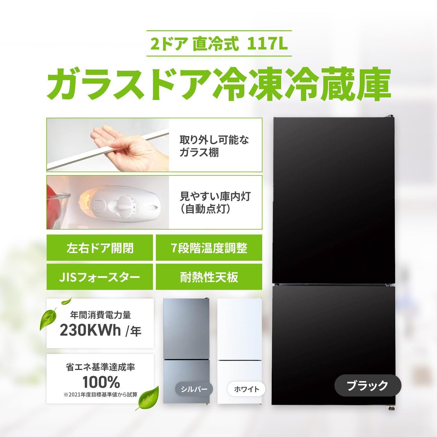 [東京Deco] 冷蔵庫 117L 2ドア 直冷式 ガラスドア 幅47cm シルバー 左右開き可能 (冷凍室30L:冷蔵庫87L) [温度調節7段階/庫内自動点灯/耐熱性天板/仕切り板取り外し可能] コンパクト 一人暮らし 二人暮らし 新生活 省エネ 静音 おしゃれ シンプル 大容量 家庭用 オフィス 冷凍冷蔵庫 117リットル w026