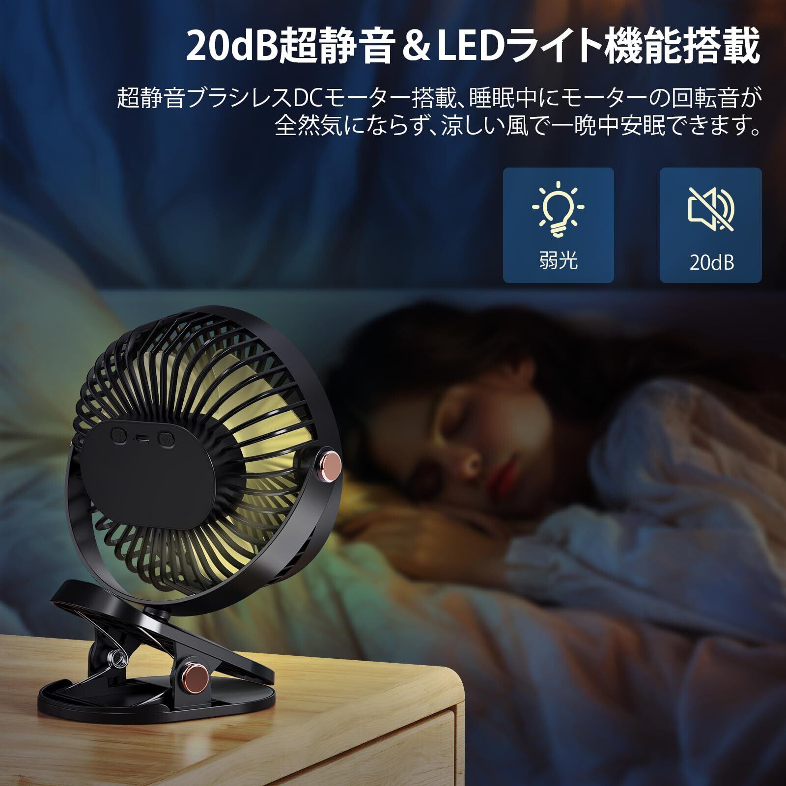 ・特徴:4000mAh大容量バッテリー、20時間連続使用、20dB静音、風量4段階調節、リズム風、360度角度調整、LEDライト機能、USB-C充電式、クリップ式