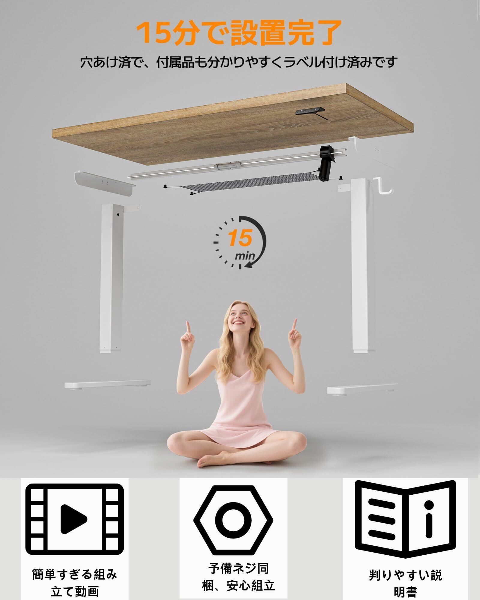【簡単に組み立てられる電動昇降デスク】:デスクトッププラットフォームは3つの部分に分かれています。簡単な設置設計を採用し、分かりやすい設置説明書が付属しており、15分で設置が完了します。