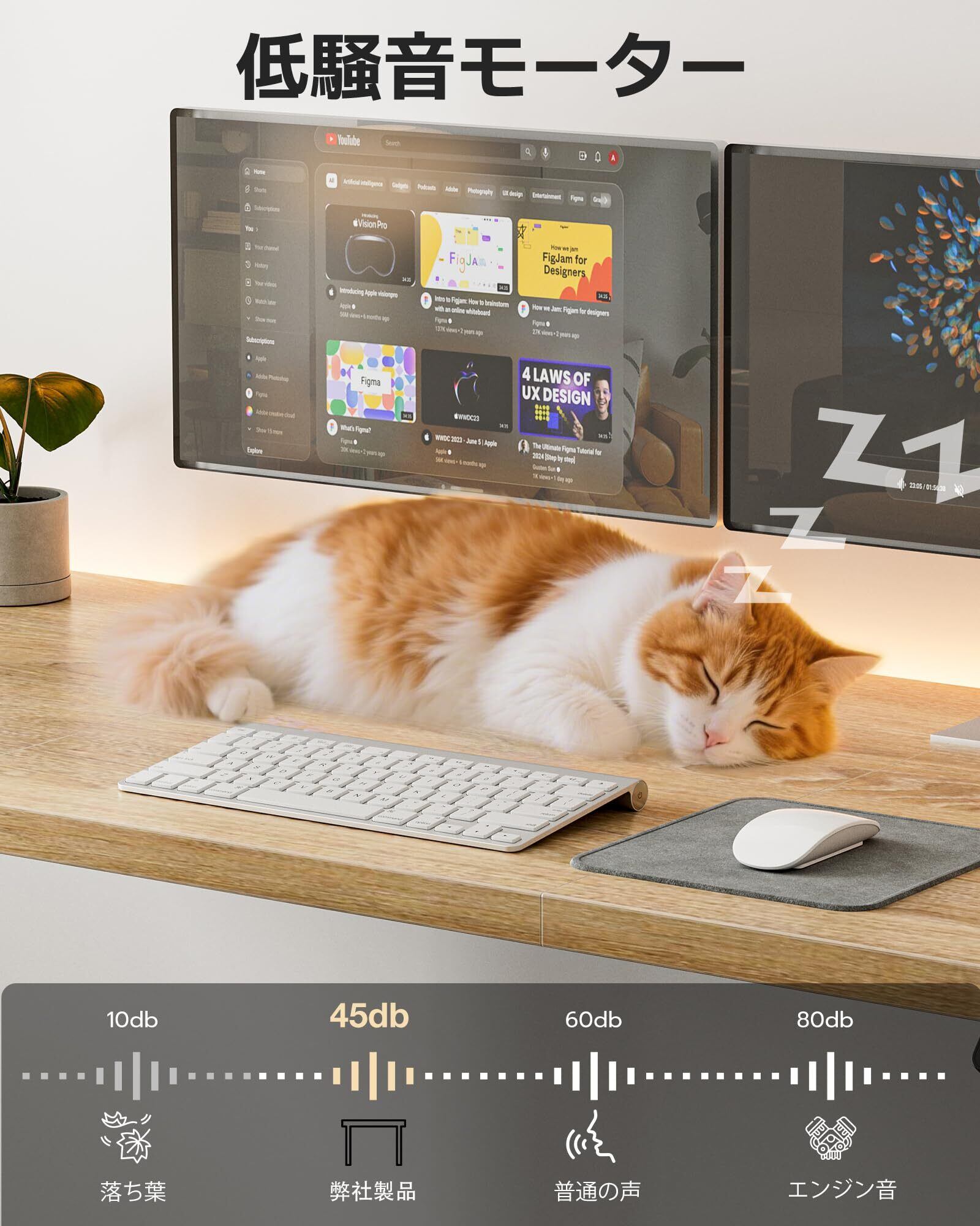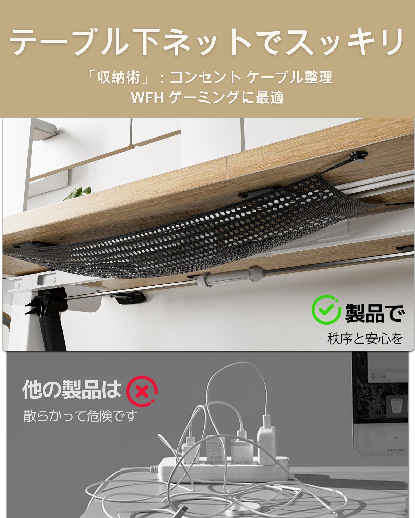 ・特徴:電動昇降式、高さ調整可能、静音設計、耐荷重80kg、ケーブルラック付き、収納フック付き