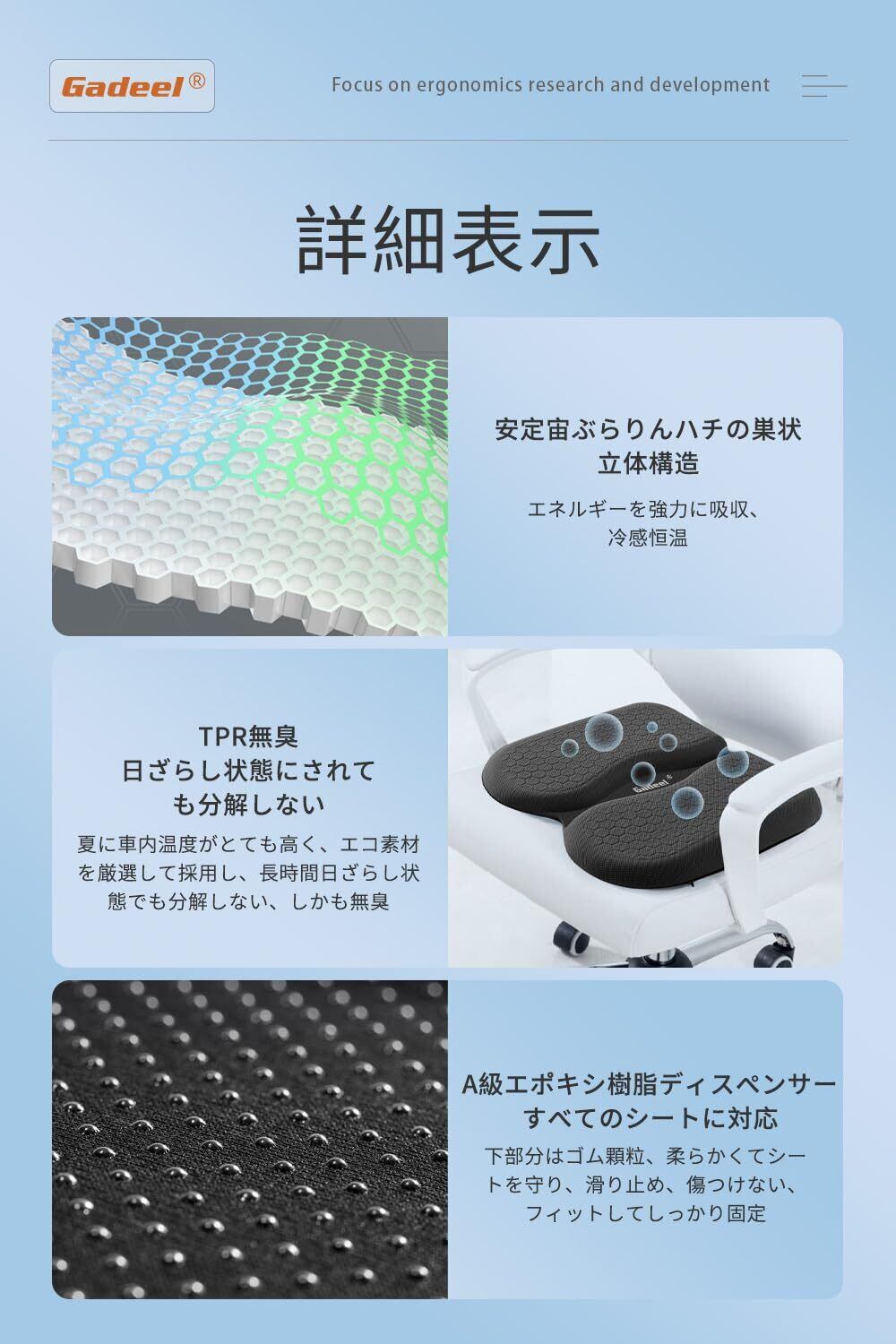 『Gadeel ゲルクッション』は、長時間の座業に最適なアイテムです。特大サイズで贅沢な広さを提供し、ハニカム構造が体圧を分散させ、坐骨をサポートします。これにより、お尻が痛くなる心配も軽減され、快適な座り心地を体験できます!