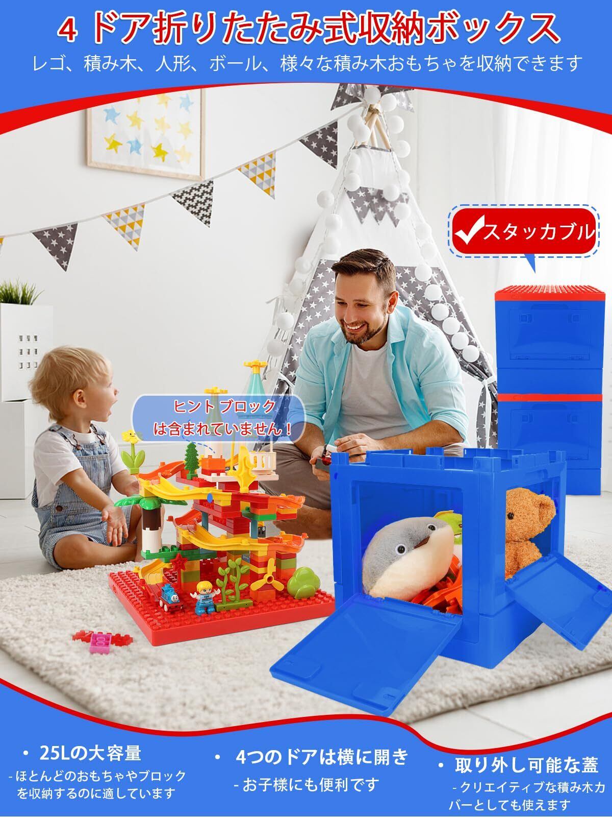 【大容量とブロックカバー】プラスチック収納ボックスの容量は25リットル、サイズは32×32×32cm(12.6“×12.6”×12.6")で、さまざまなおもちゃを収納できます。使用しないときは、ボックスは高さ10cm(3.9インチ)に折りたたむことができ、50%以上体積を縮小して、壁の隅や本棚にきれいに収納できます。ブロックベースカバーには大型または二重層のブロックにも対応しており、子どもたちは遊びながら収納することで創造力を刺激します。