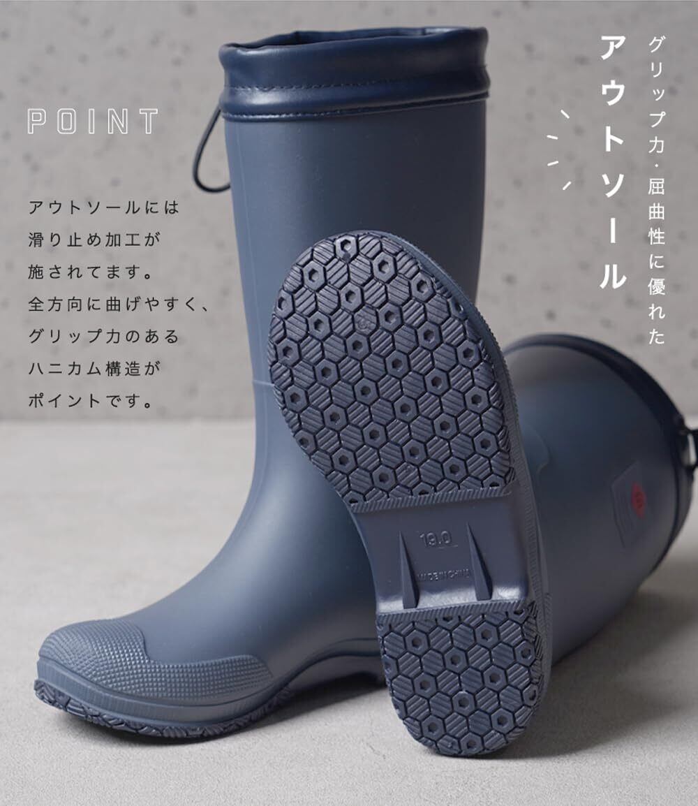 耐水性に優れた素材を使用しており、ぬれた足元をしっかり守ります。内側には通気性の良い素材を採用しているため、長時間の着用でも快適さを保ちます。活発なお子様にも安心してご使用いただけるデザインです!