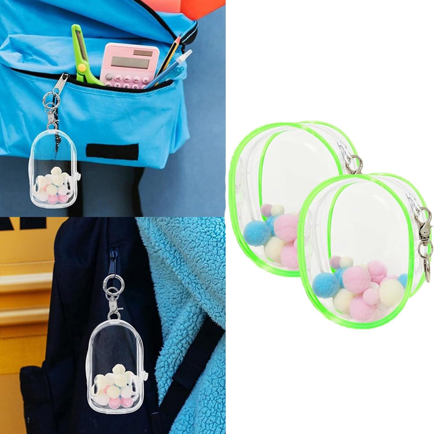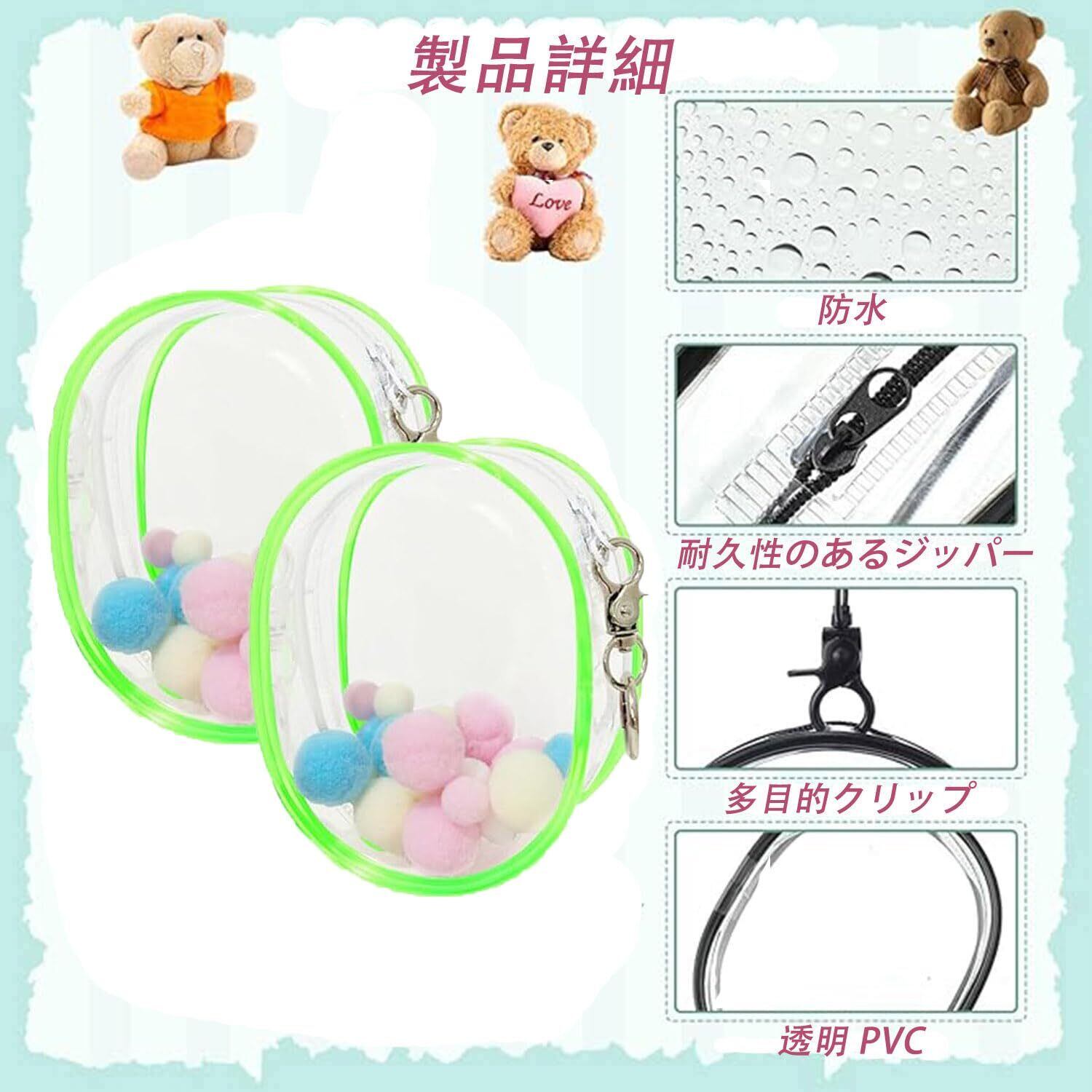 【外観】可愛い楕円形ぬいポーチは透明なPVCを採用して、耐久性があり、ジッパープルは厚みのあるキーホルダー付き、カバンにひっかけるデザイン。ポーチ内部はポンポンボールを付き、いらない場合は取り出してください。