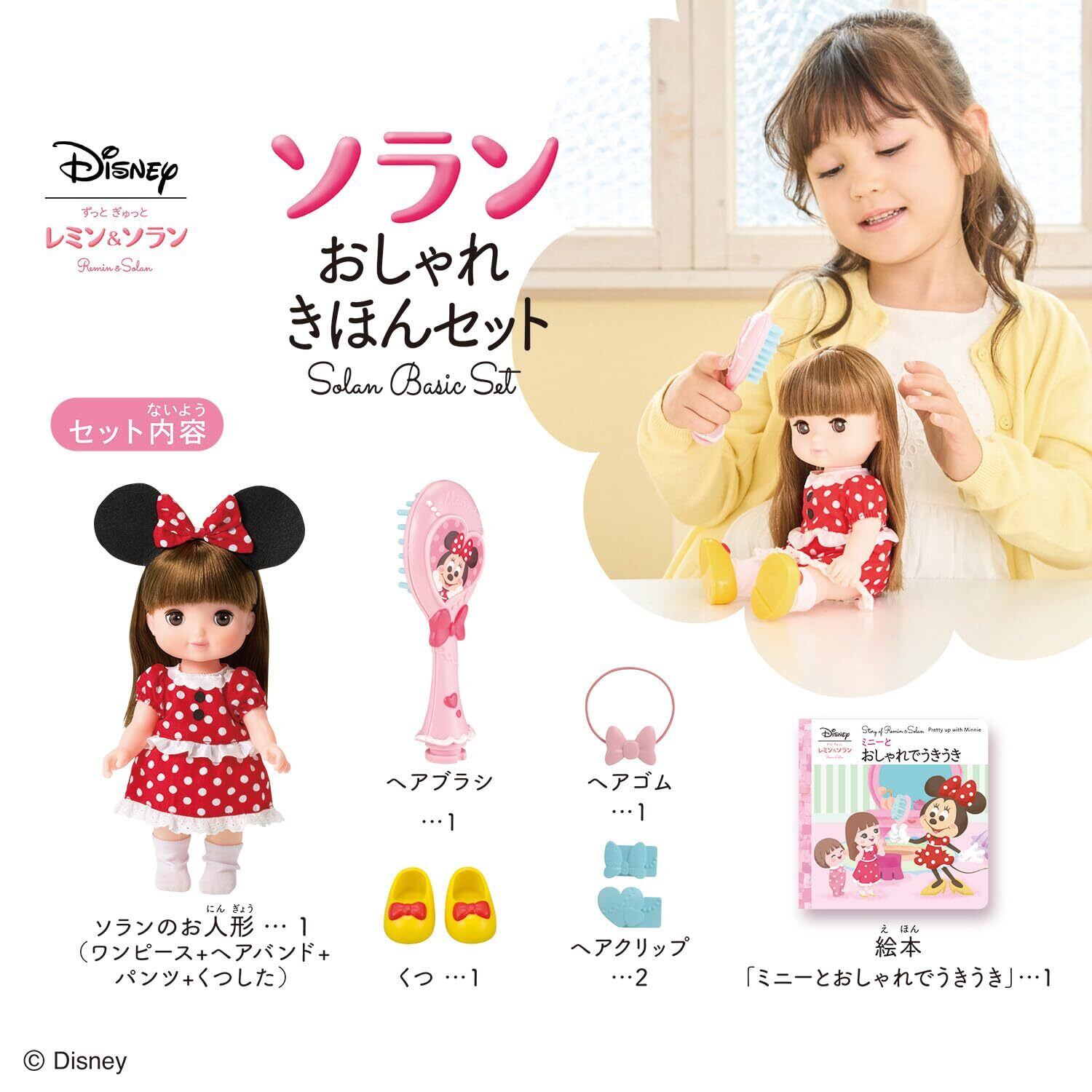 セット内容:・ソランのお人形(ワンピース、ヘアバンド、パンツ、くつした):1・ヘアブラシ:1・ヘアクリップ:2・ヘアゴム:1・くつ:1・絵本(ミニーとおしゃれでうきうき):1