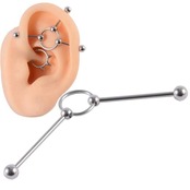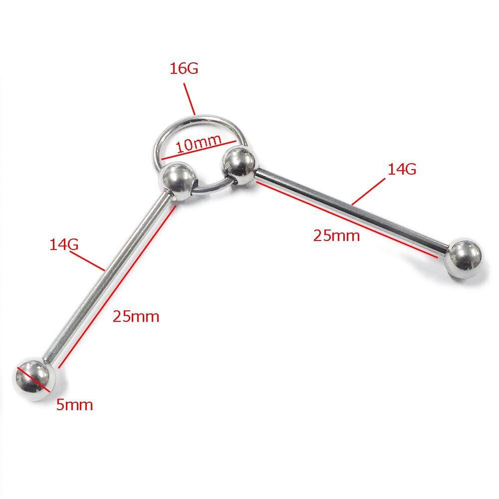 ステンレス製の14Gのストレートバーベルに16Gのキャプティブビーズリングのシャフトをセットし、そこに14Gのストレートバーベルを通したインダストリアル用ボディーピアス。 スレイブバーベル(ストレートバーベルとキャプティブリングをつなげたアイテム)と穴あきのボールをセットしたストレートバーベルの2つをリンクさせた個性的なボディピアス。 リングに通したバーベルは動くので好きな角度でインダストリアルができるので比較的使いやすい。インダストリアルのホールが真っ直ぐ2か所開いていない人でも、2か所をつなげたい人でもこのピアスがあれば、安心。男性からも女性からも人気のインダストリアルボディピアス。2個買って3本バーベルを通したり4本通したりしても面白い。メンズでもレディースでも使えるのでペアルックやプレゼントにもおすすめです。 (ご購入の際のご注意) バーベルのネジボールとビーズリングのボールはどれも取り外し可能です。