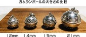 ガムランボールの音色は、大きさ(直径)に比例します。 13mm以下のガムランボールの音色はとても小さいです。 音色重視でお求めの場合は15mm以上の商品をお勧め致します。 また、手作りで作成しているので同じ大きさ(直径)でも音色が異なります。 音色重視のお客様は店頭での購入をお勧め致します。