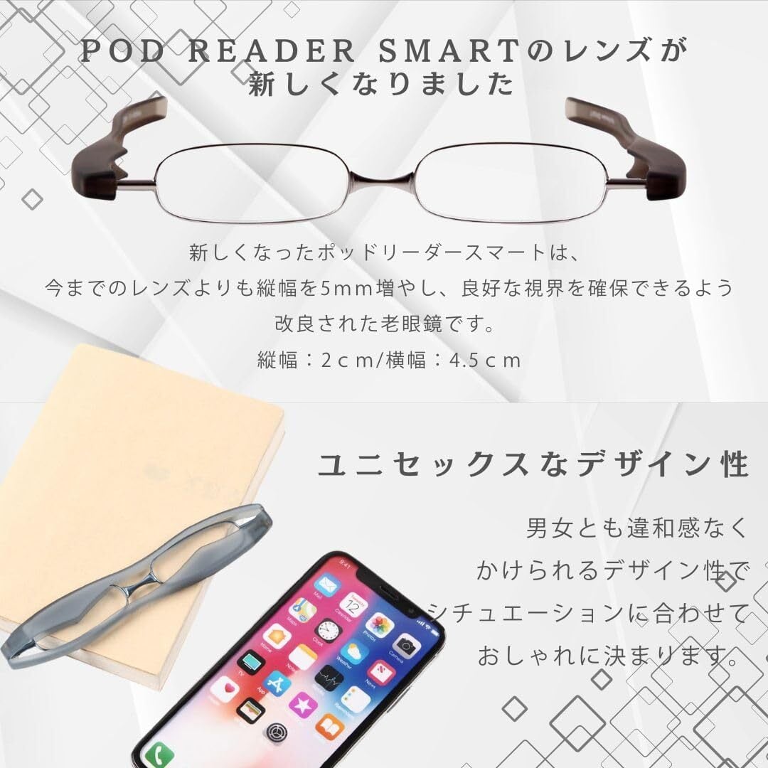 ポッドリーダースリムより、縦幅が5mm大きいので、スリムでは見づらさを感じていた方にも使いやすいサイズです。レンズは薄くて軽い両面非球面レンズなのでゆがみが少なく、クリアで快適な視界です。非球面レンズと球面レンズの違いは球面レンズはレンズがカーブしているので中心部分はゆがみが少ないですが中心から離れるほど歪んで見えます。その中でもポッドリーダーは両面非球面レンズなので、非球面レンズよりもさらに歪みが少ないです。わずか16gと軽量なので凝視しても疲れにくいです。