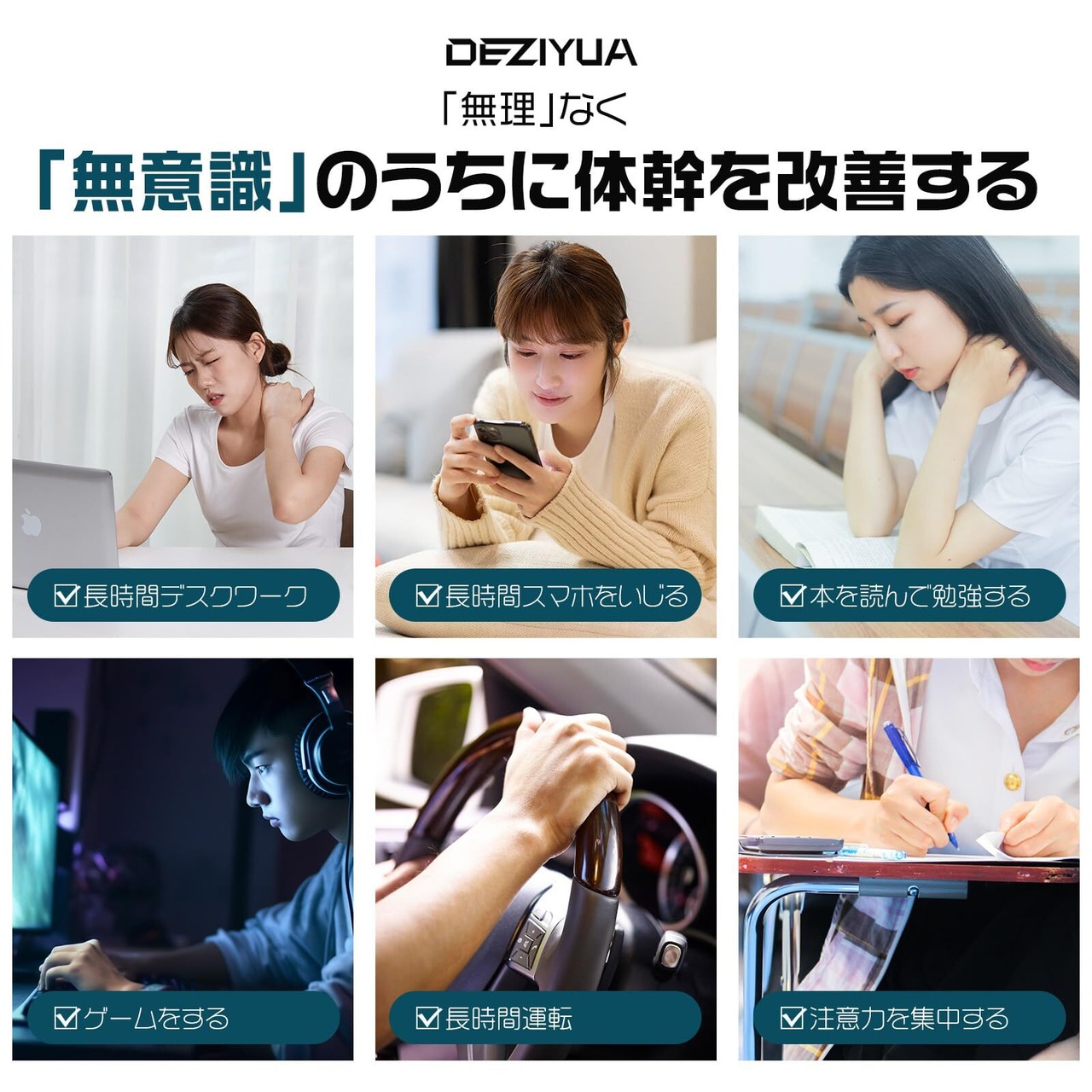 【心込めた姿勢サポーター、究極の製品!!】DEZIYUA姿勢サポーターは、現代人の脊椎の健康を守るために生まれました。調査データによれば、18歳以上の成人の23%以上が1日5時間以上もパソコンやスマホに没頭していることが判明しました。この生活様式が原因で、現代人は運動不足や筋肉不足に陥り、猫背のリスクが高まっています。こうした状況が続くと、体の姿勢や基本的な代謝も悪化し、自信と健康が失われがちです。 Deziyua社はこの問題に真剣に取り組み、専門の姿勢指導先生による監修も受け、一年以上にわたる研究と努力の末、この猫背ベルトが誕生しました!この姿勢サポートベルトは、シンプルでありながらも軽薄なデザインで、背部に最強のサポートを提供します。「無理」なく、「無痛」で、「無意識」のうちに猫背を補正し、最も美しい姿勢へと導いてくれます!DEZIYUAは、姿勢健康に真摯な思いを込めたデザインの原点です!