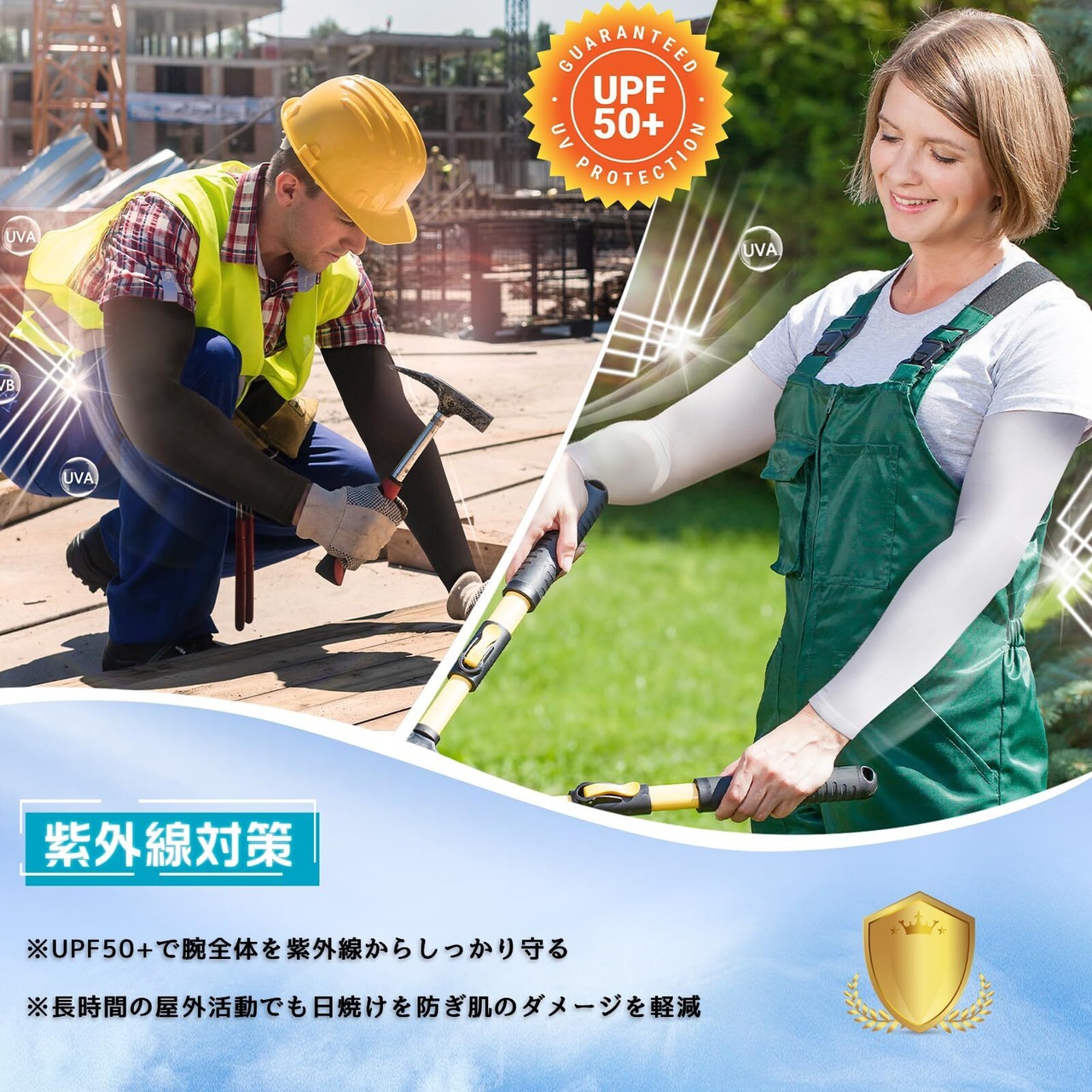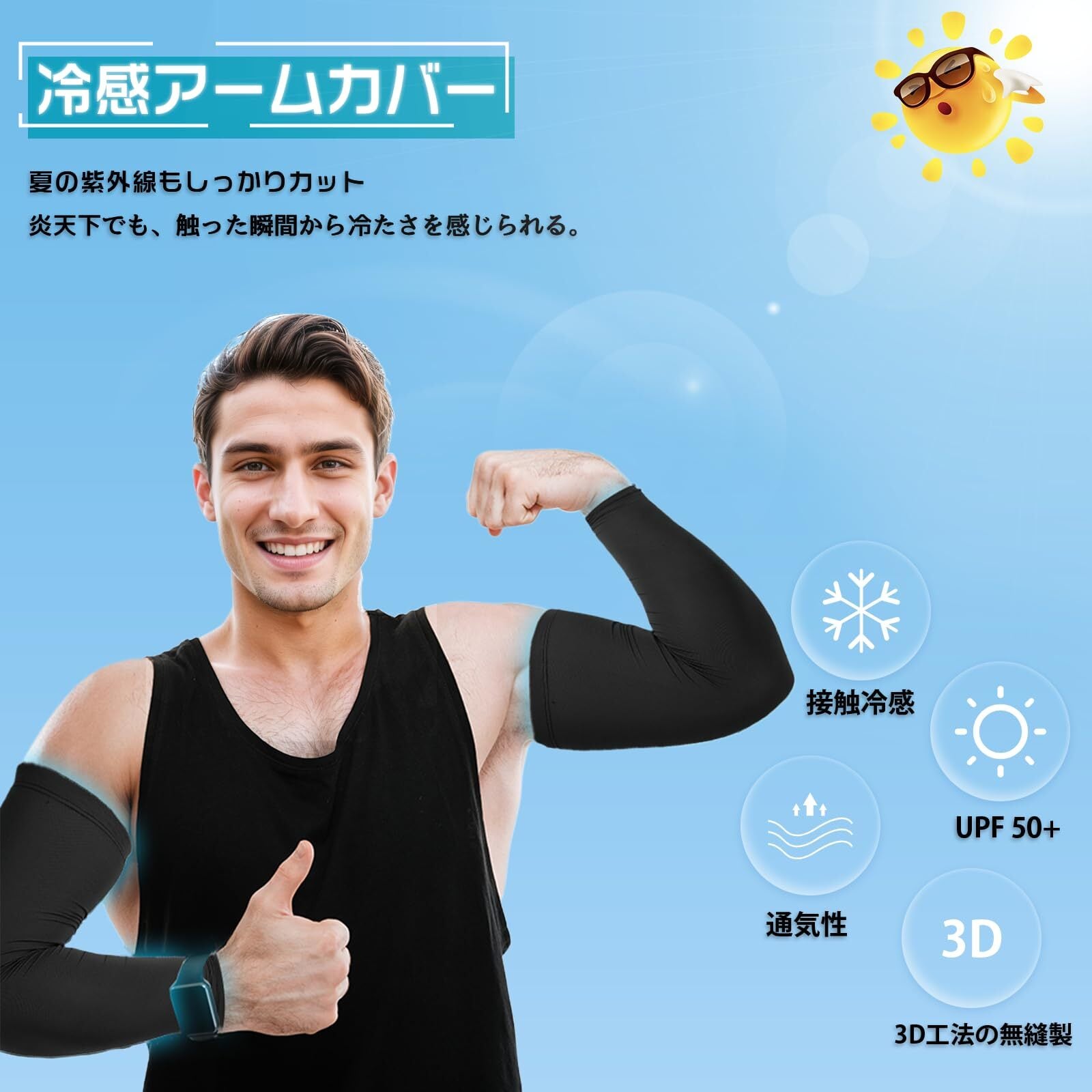 【日焼け対策】:高エネルギーの紫外線を強力に吸収し、太陽の有害な損傷から腕を最大限に保護できる紫外線吸収剤で処理されます。UVカット、吸汗速乾、抗菌防臭機能。