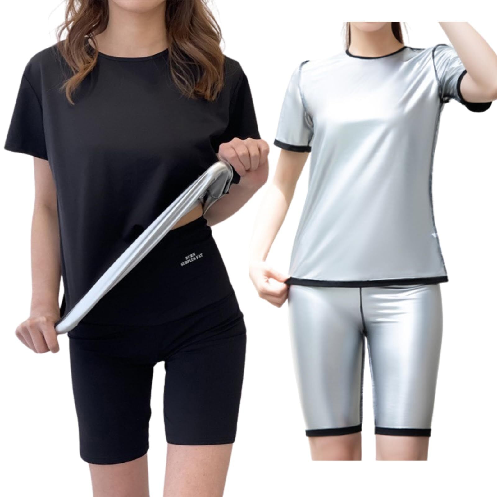 【外見はサウナスーツに見えない?!】クルーネックの半袖Tシャツに、ハイウエストのショーツが、裏面はシルバー加工と分からずに、ダイエットしてます感を感じさせない印象にシャカシャカ音も少なめ
