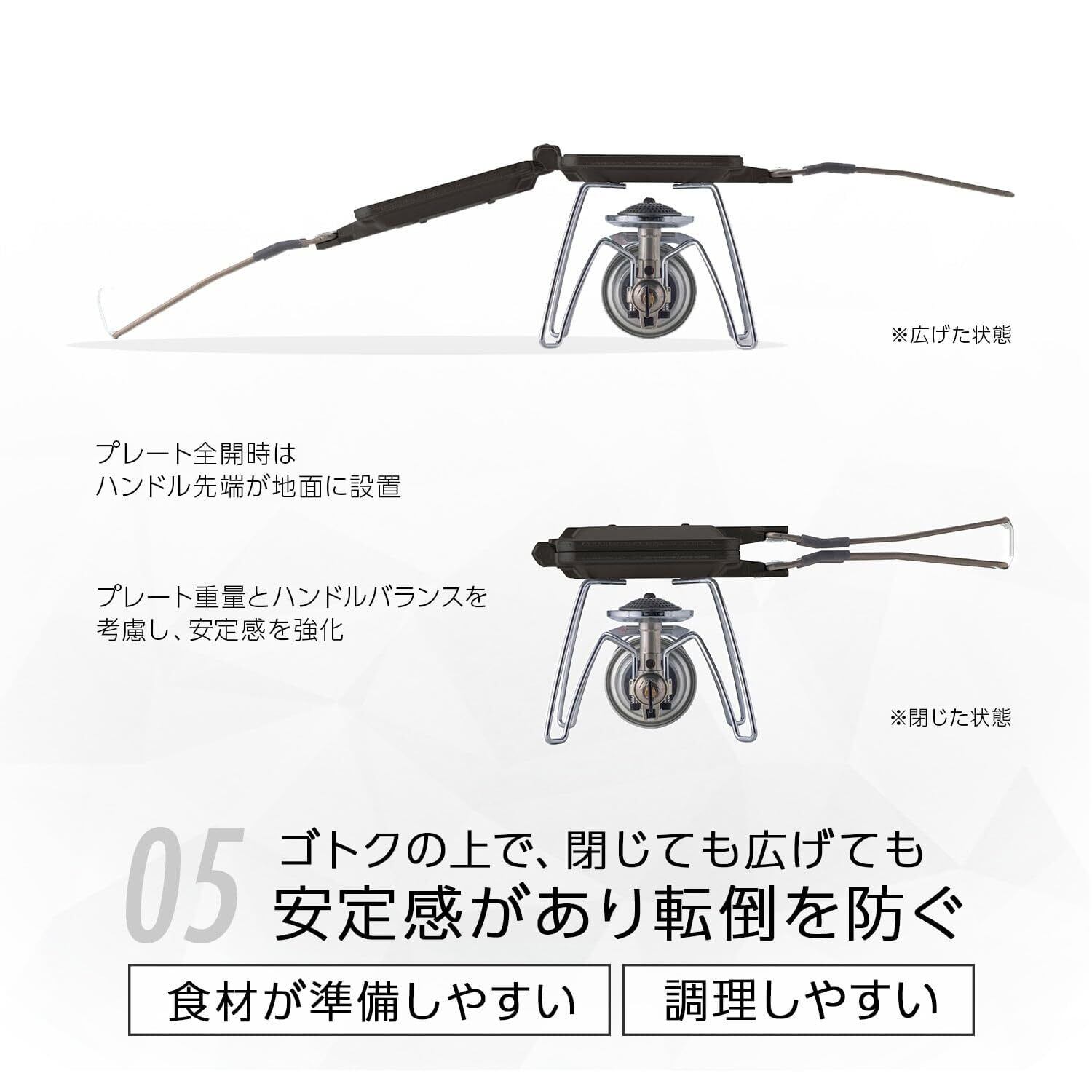 折り畳みハンドルを搭載し、持ち運びが非常に便利です!プレートは着脱式で、お手入れも簡単。収納ポーチ付きだから、片付けもスムーズに行えます。シングルサイズのデザインは、少人数のキャンプやちょっとしたおつまみにも最適です。