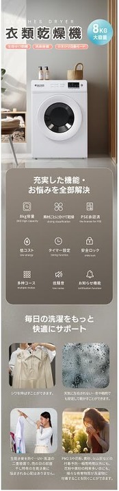 【大容量】8kgの大容量で、一度に多くの衣類を入れられるので大家族に最適です。乾燥量が多く、時短で乾燥し、乾燥回数が減らして、電気代なども節約できます。