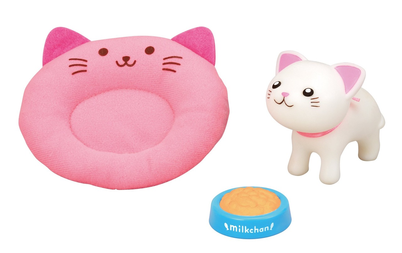 商品(右): メルちゃんのねこちゃんペット。名前は「ミルクちゃん」。