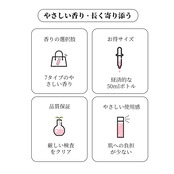 【長時間ふんわり香る処方】軽やかで自然な香り立ちが魅力。肌や髪に優しく香りがなじみ、時間が経っても清潔感のある印象をキープ。朝のひと吹きで一日中好印象。
