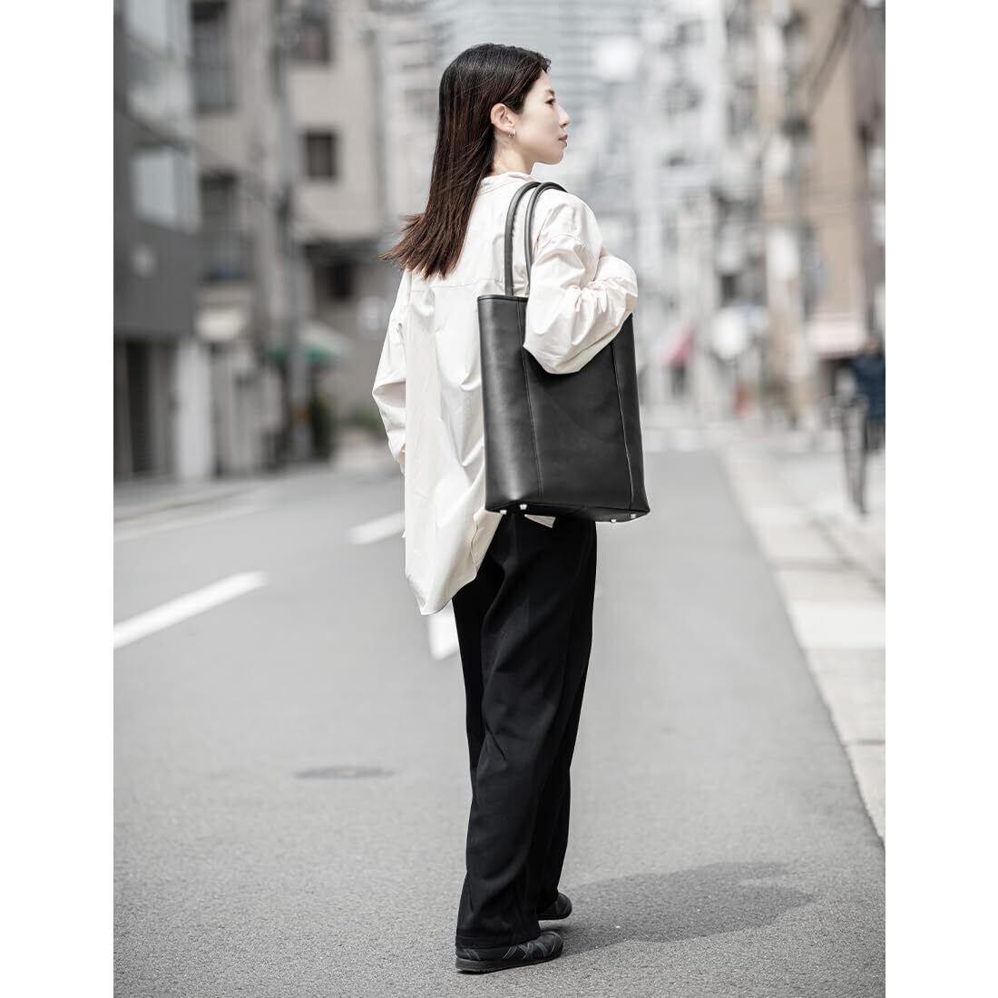 【すっきりスマートなデザイン】機能性にこだわったトートバッグ。 マグネット開閉式で大きく開く間口部。肩にかけやすい長さのハンドル設計。装飾を廃した無駄のないシルエットは、シーン問わずお使いいただけます。