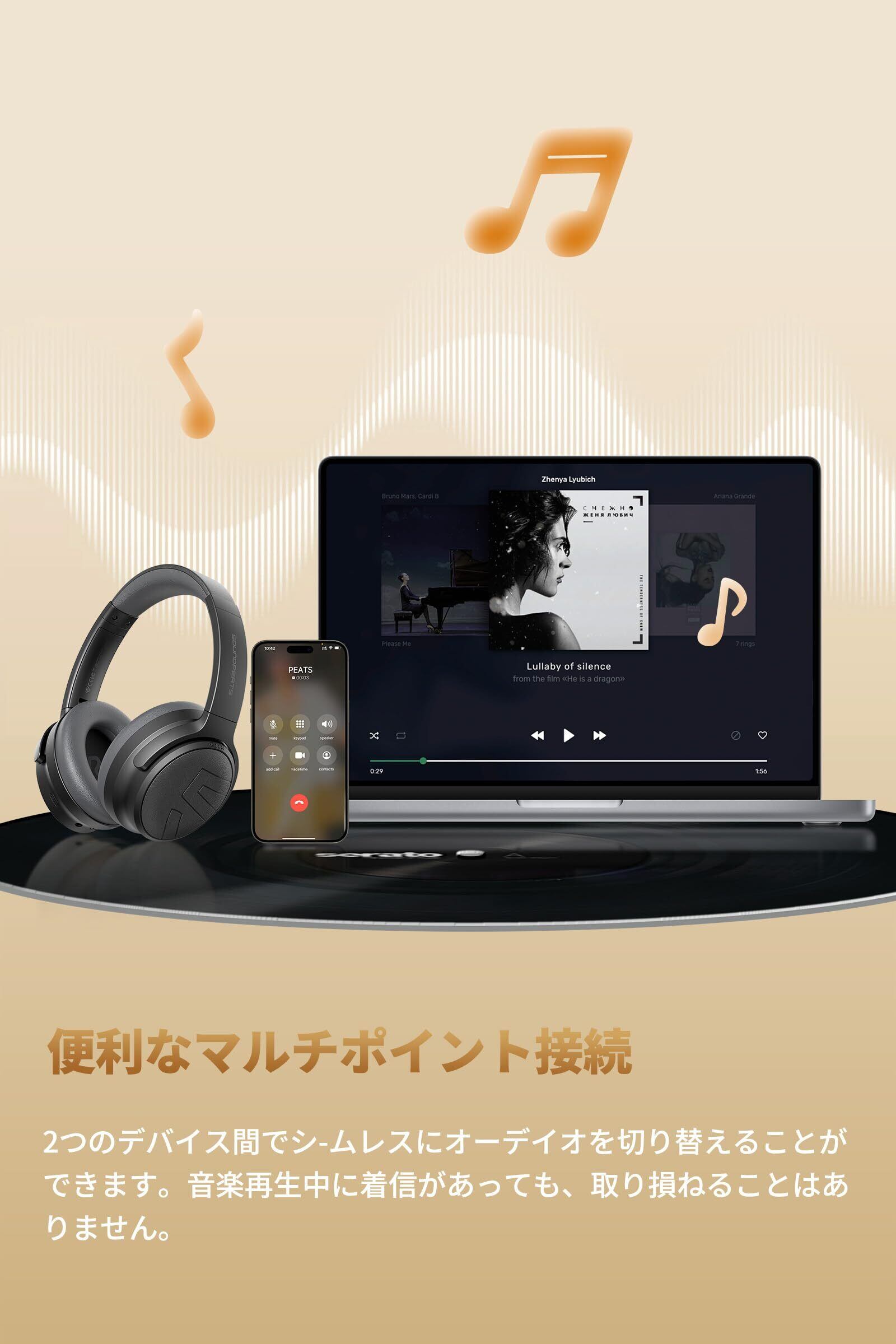 このヘッドホンは、ワイヤレス接続だけでなく、USB-CやAUXケーブルによる有線接続にも対応。マルチポイント機能を搭載し、複数のデバイスに同時接続可能なのも大きな魅力です。仕事やプライベート、さまざまなシチュエーションで快適にお使いいただけます。