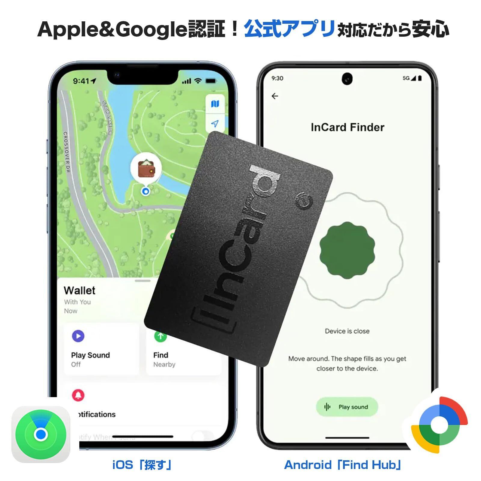 【最強かも!iOS・Android全対応のエアタグ カードが登場!】InCard Finderを選ぶ理由>>(1)Apple&Google認証済み!iOS・Android公式アプリ対応!技適認証も取得済み。(2)業界最薄!厚さわずか1.6mm!クレカ2枚分の薄さ!(3)充電・電池交換不要!最大10年使える!(4)米国製高性能チップ搭載!アメリアで大人気。(5)IP68最高レベルの防水防塵!丸ごと水洗いOK。(6)100dB大音量ブザー搭載&LEDランプ搭載!見つけやすさ抜群。(7)丈夫で折れにくい設計。(8)質感のあるスリムな本体と高級感あふれる化粧箱で、ギフトに最適!【対応機種】iPhone、iPad、Google Pixel、Xiaomi、Samsung Galaxy、Sony Xperia、Sharp、Oppo、Rakutenなど、Android 9以降、iOS 14.5以降の端末に対応。【注意事項】iPhoneとAndroid端末の同時接続は不可。AndroidではHUAWEI非対応。中国、イラン、北朝鮮など一部地域で利用制限あり。