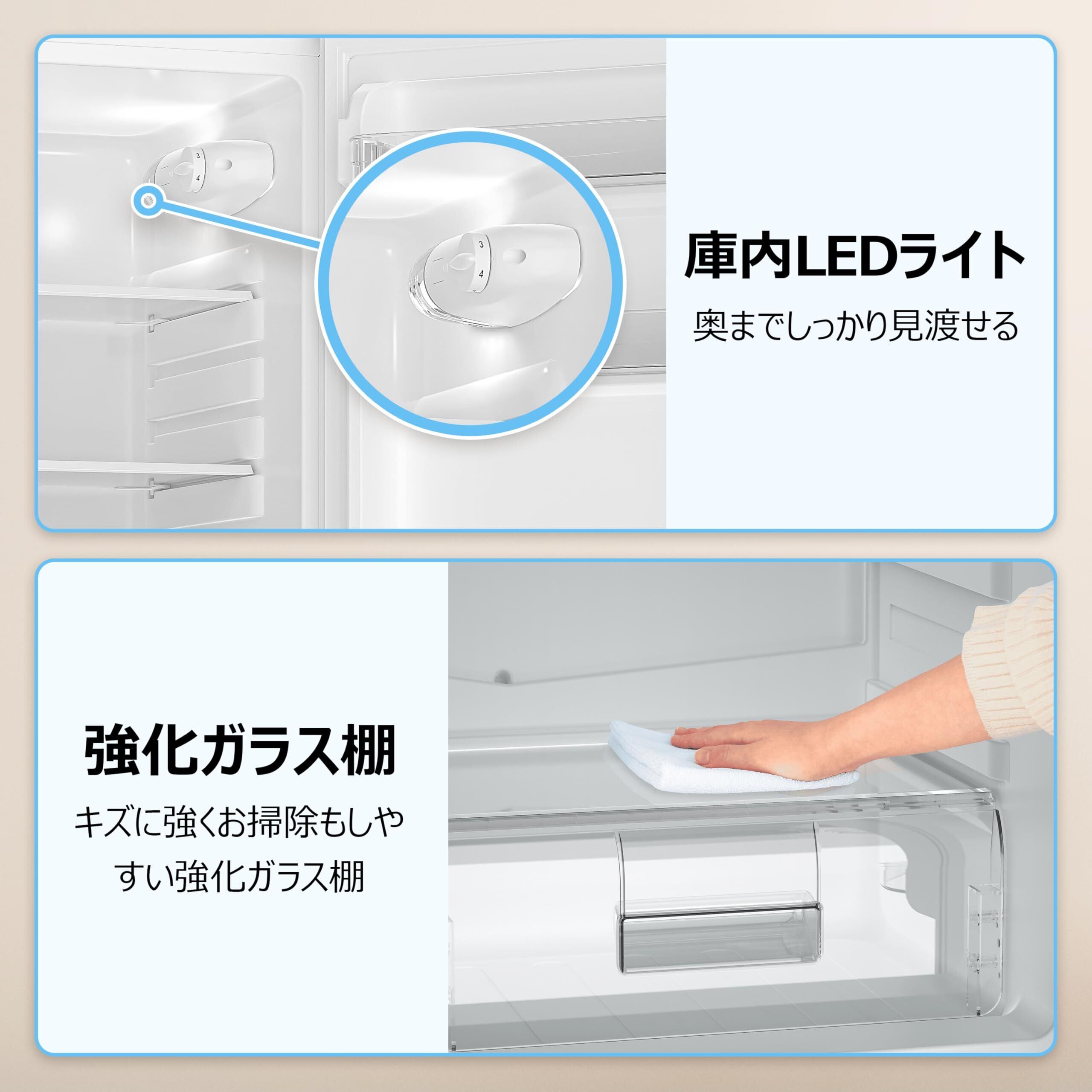 この冷蔵庫は、126Lの広々とした庫内容量を実現。冷蔵室はもちろん、下部の野菜ケースもしっかり確保されており、食品の整理が楽チンです。強化ガラス棚は、収納物をしっかり支え、見た目もスタイリッシュでお手入れも簡単です。毎日の食材管理を快適にサポートします。