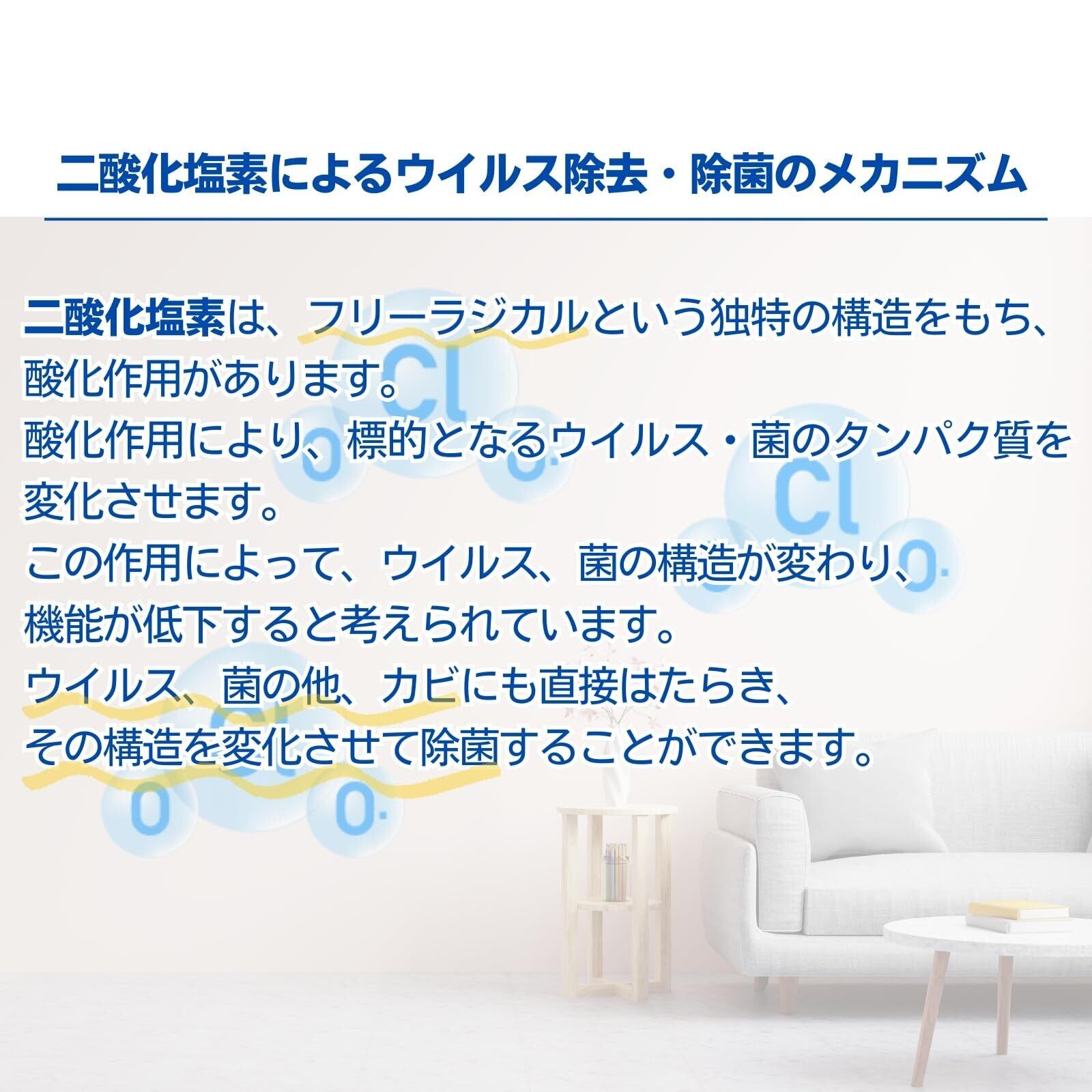 内容成分と空気中の水分と炭酸ガスが反応して低濃度の二酸化塩素が発生