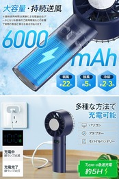 【6000mAh大容量・高速静音ブラシレスモーター】超大容量6000mAhバッテリー搭載で、約5時間のフル充電で、最大約22時間の連続使用が可能。バッグや車に常備しておくと、いつでもどこでも涼しさを手に入れます。最新静音性に優れ、省エネ効果も高いANCブラシレスモーター搭載、高速回転でも騒音25dB以下の超静音設計。パワフルかつ省エネで、一日中涼しさを持続します。(※連続使用時間は実験による理論的なデータとなりお客様のご使用環境などの影響で実際の数値と異なる場合があります。)