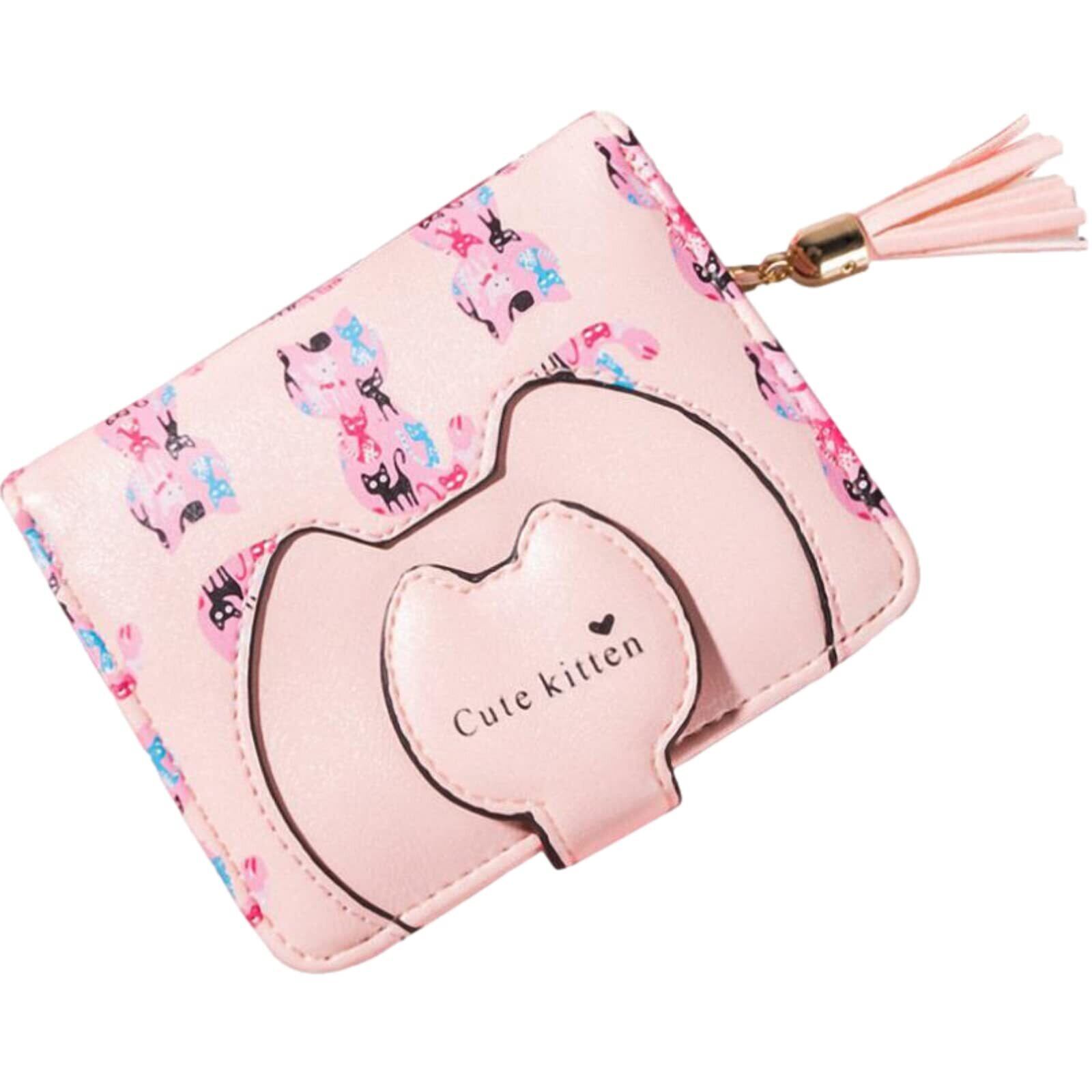 [ソユル]2つ折り 財布 おさいふ 猫 ねこ PUレザー 合皮 スナップ 留め ファスナー 開閉 タッセル 小学生 中学生 女の子 女子 女児 カジュアル (ピンク)