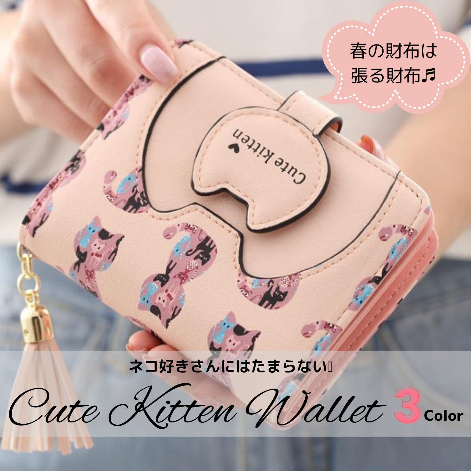 【在庫セール】[ソユル]2つ折り 財布 おさいふ 猫 ねこ PUレザー 合皮 スナップ 留め ファスナー 開閉 タッセル 小学生 中学生 女の子 女子 女児 カジュアル (ピンク)