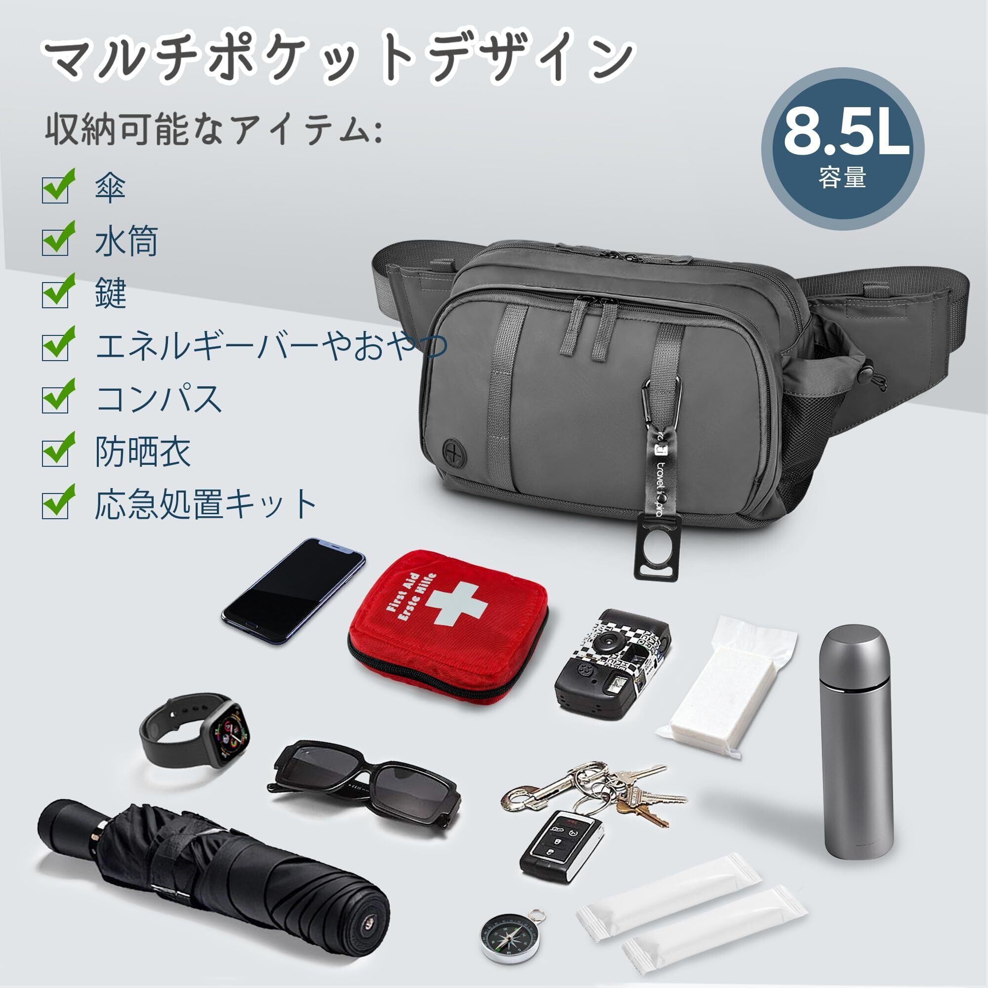 Travel Inspira 3WAY ウエストバッグ メンズ ヒップバッグ 大容量 8.5L収容 ズレ防止設計 全天候対応 [ペットボトルホルダー/耐摩耗性] 登山 自転車 ツーリング キャンプ アウトドア ランニング セキュリティポーチ ナイロン バッグ 通気性 コンパクト グレー