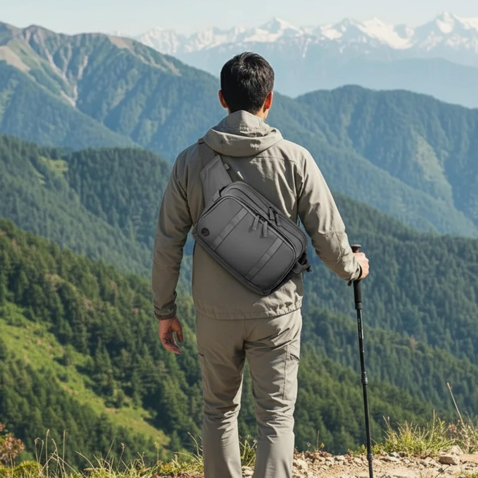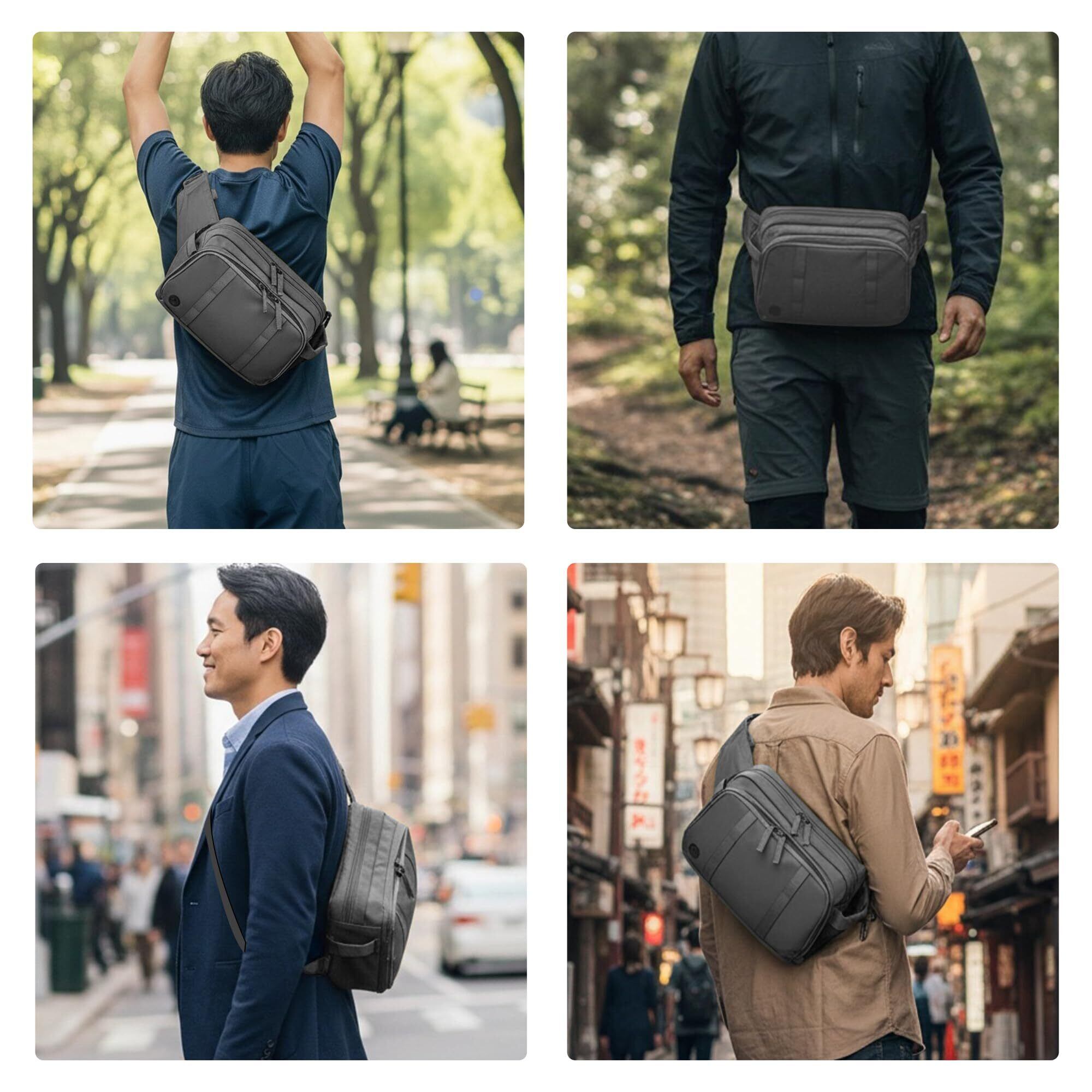「3WAY使い分けでシーンに最適なスタイルを実現」 ショルダーバッグ・斜め掛け・ウエストポーチの3スタイルを瞬時に切替可能。ビジネス会議からジムトレーニング、海外旅行まで、男性の体型にフィットする調整式ベルトでスマートに着こなせます。