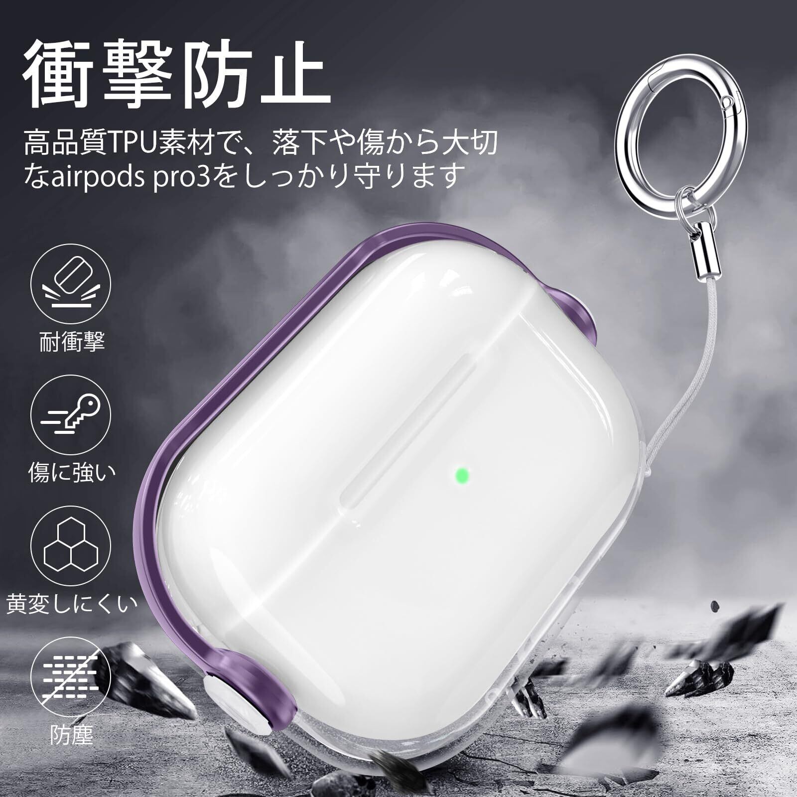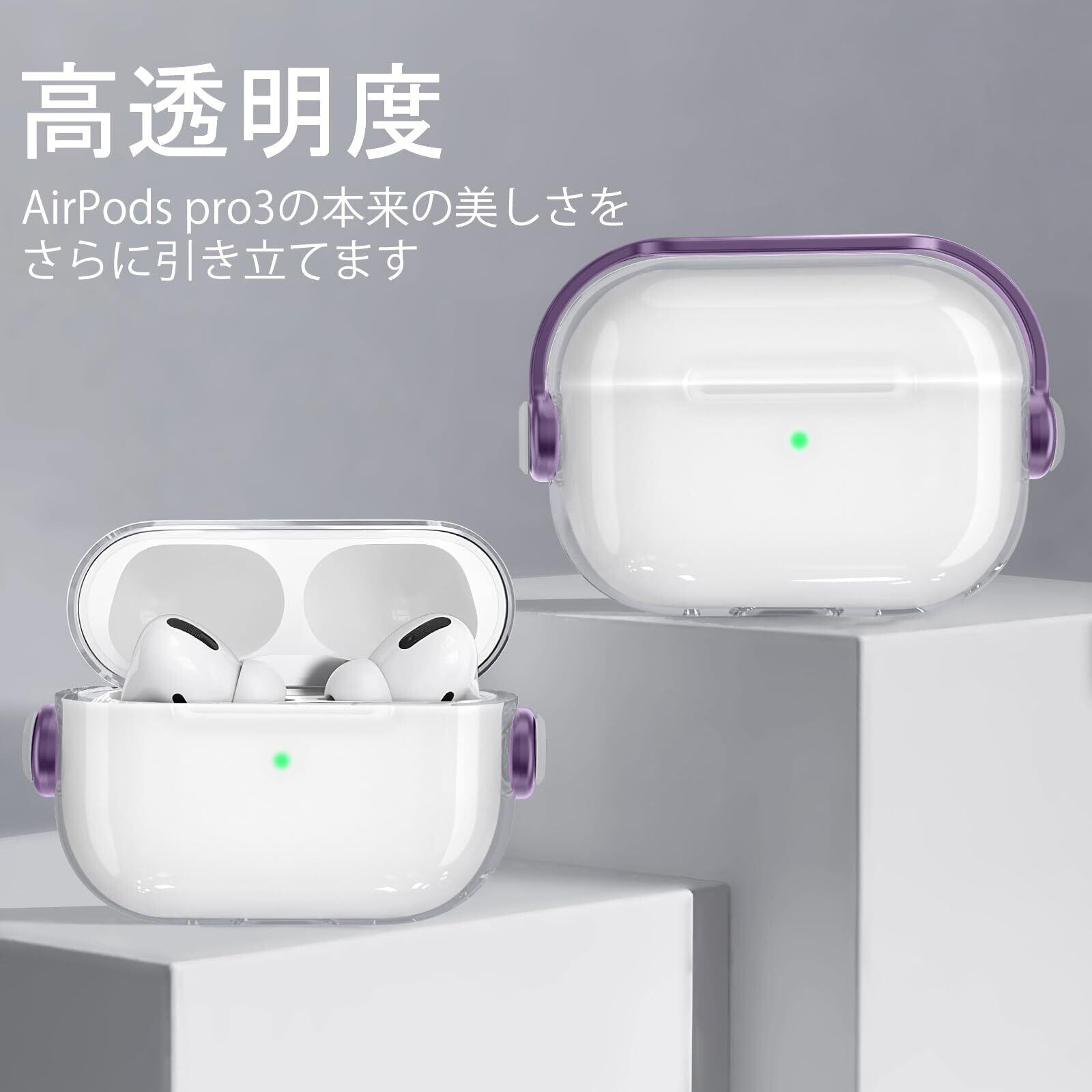 HEIGKOIK AirPods Pro 第3世代 ケース 2025年発売 エアポッズプロ3 カバー TPU クリア 透明 黄変防止 ロック付き LEDインジケーター可視 耐衝撃 落下防止 カラビナ付き 携帯便利 スタンド機能 ワイヤレス充電対応 おしゃれ かわいい 軽量 薄型(透明+パープル)