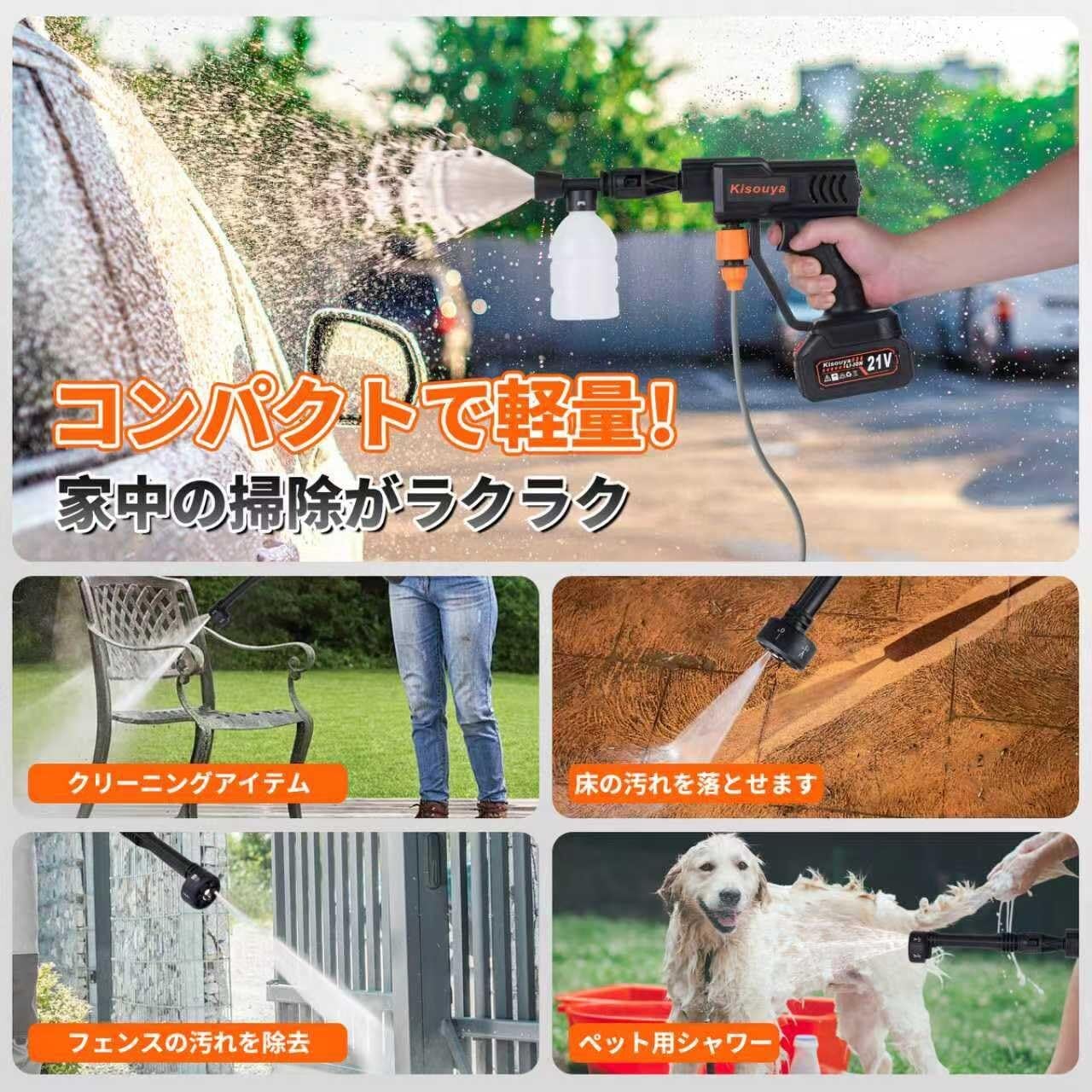 【Kisouya 高圧洗浄機 コードレス 充電式9MPa噴射圧で洗車や大掃除に便利】ブラシや雑巾などの他の洗浄ツールとは異なり、高圧洗浄機は水だけで簡単に洗浄できます。強力な9MPa噴射圧と最大12メートルの範囲で、長年蓄積された頑固な汚れも落とすことができます。多用途性を高めるための様々なオプションアクセサリー、セルフプライミング機能、持ち運びに便利なコンパクトサイズ、切り替え可能な水と泡ノズルを備えた6in1ノズルで、扇形の水流で効率的な洗浄が可能です。足回りや排水溝など、届きにくい場所の洗浄に最適です。高圧ホースは接続が簡単で、ノズルの先端を回転させることにより、6つの異なる水流を使用でき、さまざまなシーンで活躍します!洗車、庭、屋外、階段、網戸や窓ガラス、ブロック塀、駐車場、玄関、自転車やバイクの洗浄、バルコニー、高い場所、家の周り、浴室、年末の大掃除、キャンプ用品の洗浄、バーベキューの片付けなどにも大活躍。車用クリーナーには折りたたみ式の大型バケツが付属しているので、屋外での掃除にも便利です。
